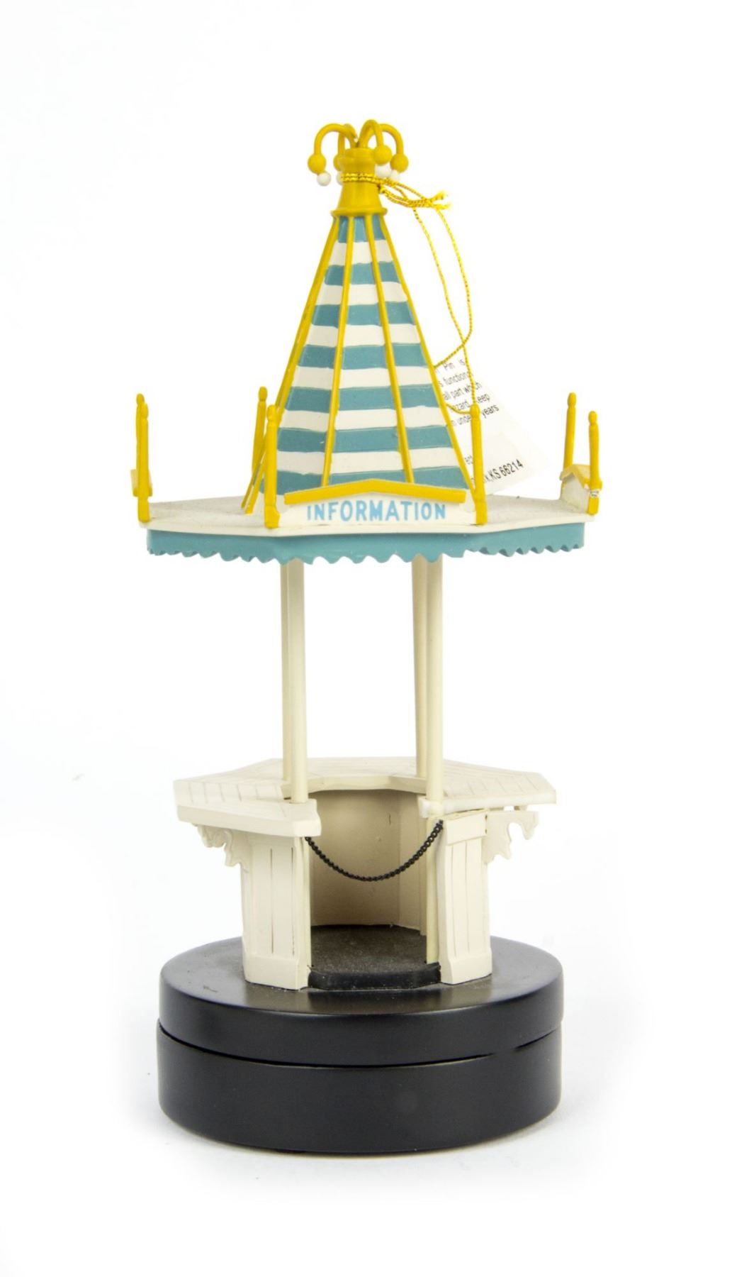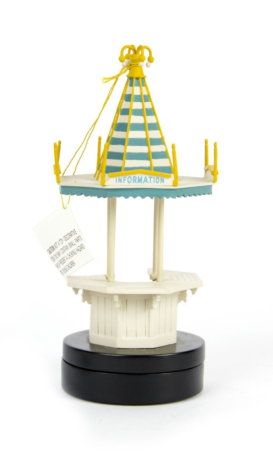 (Disneyland, 2005) A rare limited edition ticket booth replica created by Kevin Kidney and Jody Daily as part of Disneyland's 50th Anniversary. This replica depicts the Main Street ticket booth and is created in resin, metal, and wood, and was limited to only 1500 pieces. The lid of the base can be removed to reveal a special pin inspired by the original Disneyland guidebooks. This replica measures 7.5" tall and is in good condition with a few bent spires on top of the model.