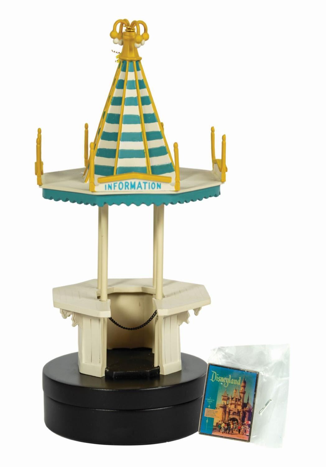 (Disneyland, 2005) A limited edition miniature ticket booth designed by Kevin Kidney and Jody Daily in celebration of Disneyland's 50th anniversary. Created in an edition of 1500, this intricately detailed miniature depicts a Main Street ticket booth and is composed of resin, metal, and wood. The lid of the base can be removed to reveal a special pin inspired by the original Disneyland guidebooks. A Disney COA and the original cardboard box packaging are included. The piece measures 7.5" tall and is in very good condition with a few bent spires on top of the model. The box measures 9.75"x5.5" and 5.5" and exhibits moderate wear.