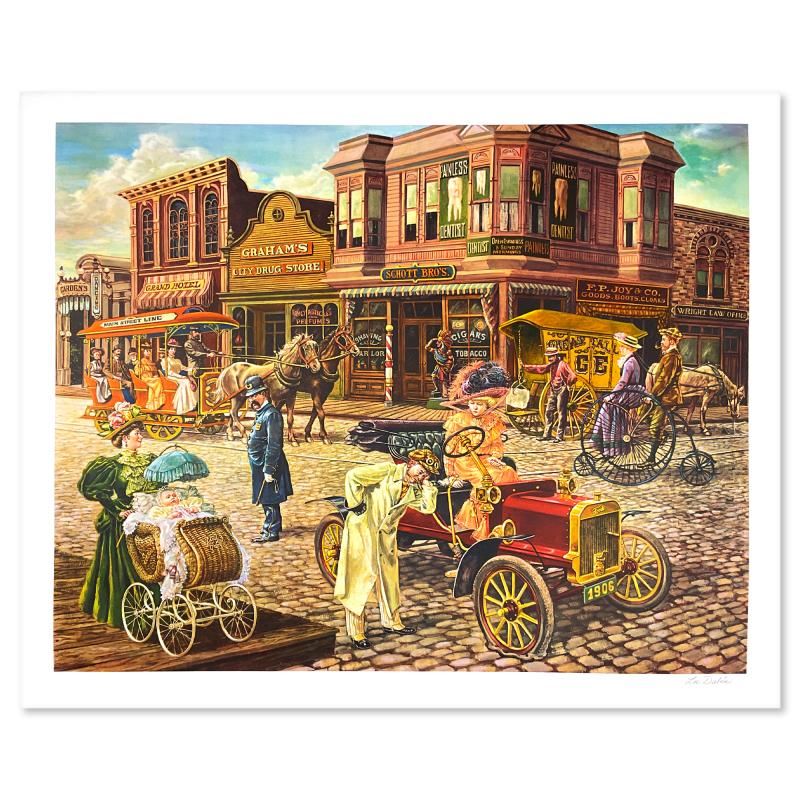 "Main Street" is a limited edition lithograph on paper by Lee Dubin, numbered and hand signed by the artist. Includes Letter of Authenticity. Measures approx. 34" x 28" (with border), 30" x 24" (image). Due to the age of this piece there may be minor discoloration, minor creases or smudges in the border area.
