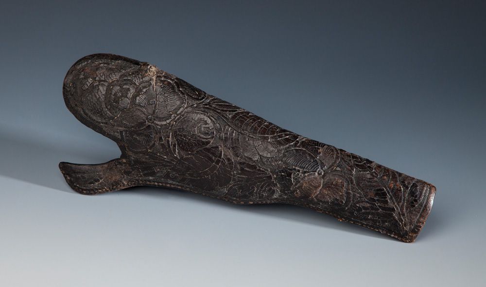 Main & Winchester, San Francisco, Calif. Holster. California Style Slim Jim Holster, marked "Main & Winchester Makers San Francisco” in oval on back of holster, floral carved, original belt loop, appears to be for a 6-inch Colt 1849 Pocket. Leather is stiff but not hard, no breaks, has some flaking at top of trigger guard curve and reverse side, doesn’t appear to have ever had a muzzle plug.