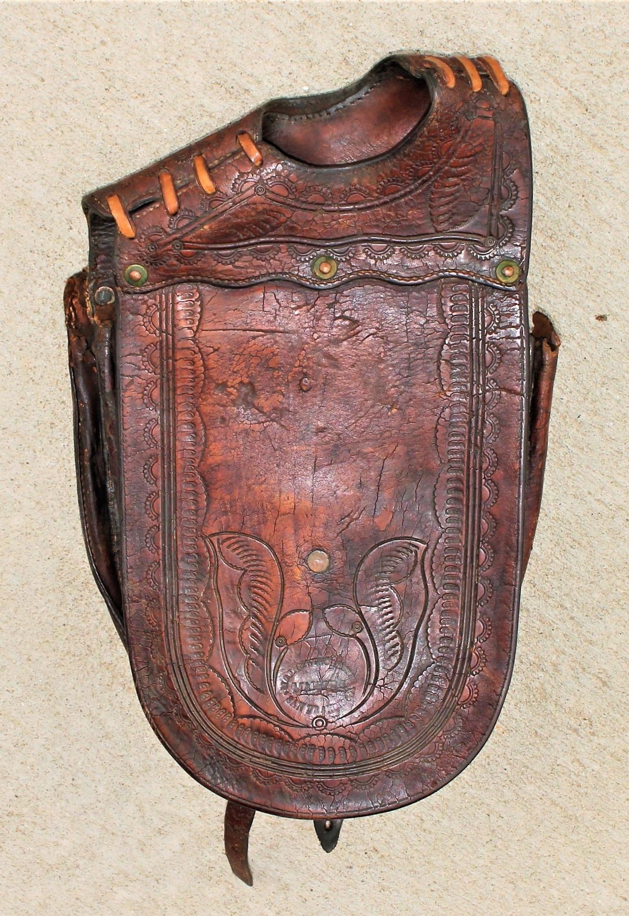 This beautiful pair of fully tooled pommel bags shows wonderful patinaed medium color, a Colt single action holster, and honest cowboy wear. Nicely marked on both flaps.
