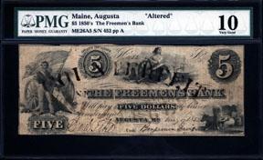 Augusta, Maine. 1852, $5, (ME26A5), Issued banknote "Altered" from Freeman's Bank, Washington, D.C., Printed in black, Soldier with flag and cannon on left, allegorical wonab on top right and woman milking cow on bottom right, overprinted "counterfeit" in curving arc on front and back of note. PMG graded "10" Very Good. TCC. Scarce early Maine note.