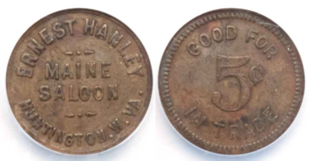 Rare West Virginia token. Maine Saloon / Ernest Hanley / Huntington, W. Va. // GF 5c IT. Genuine.City: HuntingtonCounty: State: WVDate: c1910