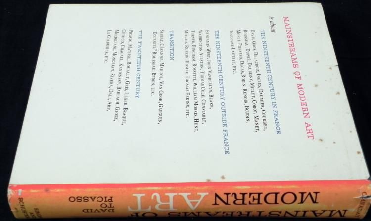 This is a Modern Art book tracing its origins from Ingres to Dada and some architecture. * Title: Mainstreams of Modern Art: David to PicassoAuthor: John CanadayPublisher: Simon and Schuster, New York Edition: FirstYear: 1962 Type: Hardcover Condition: Excellent; minor tears at the edge of the dust jacket