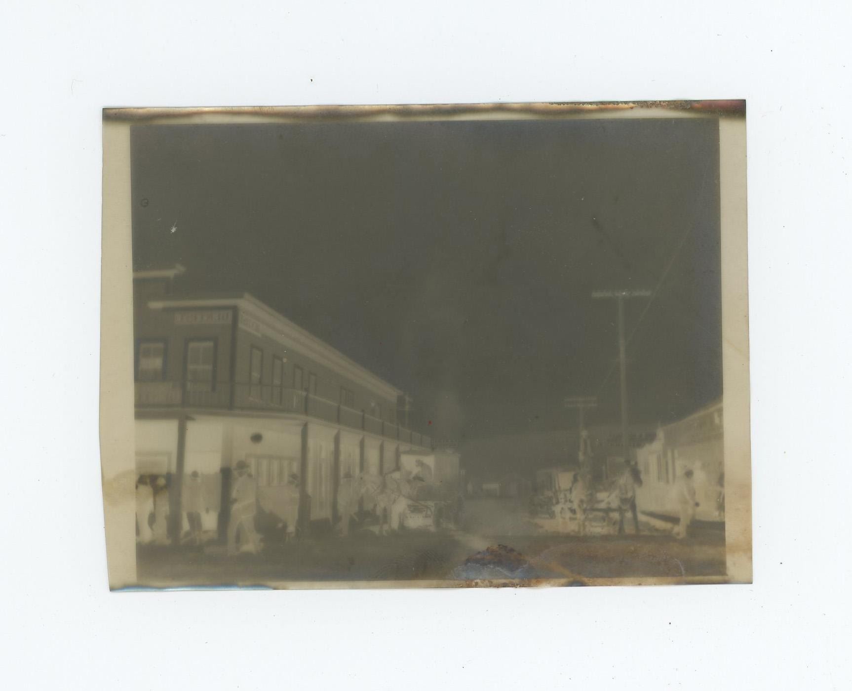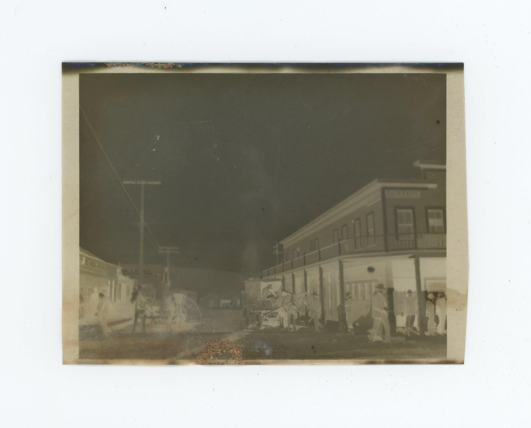 Mining Town, with the Raw Hide Hotel and Sale Mercantile store. 4 1/4" by 3 1/4". In December 1906, prospector Jim Swanson made a discovery of a rich gold and silver deposit in the hills near what became Rawhide. He was soon joined by Charles ("Charley") B. Holman and Charles ("Scotty") A. McLeod, who also found sizeable deposits nearby on Hooligan Hill. McLeod had recently been ordered to cease prospecting around the nearby camp of Buckskin, and bitter about this, he suggested the name of Rawhide for the new camp, as a play on the name of the Buckskin camp he held with contempt. Word spread, and both Holman and McLeod sold their claims to investors and moved on to Stingaree Gulch later in 1907, where they found yet another large deposit. The two men sold these claims for even more money, and then left the area to prospect elsewhere. The frenzy that these claims created soon had Rawhide booming. Investors began selling stocks at a frenetic pace, and the town soon had a population of about 5,000, with: three banks, four churches, a school, twelve hotels, twenty-eight restaurants, a theater, and thirty-seven saloons. While the original mines and claims did produce a decent profit in gold and silver, the fever created an amount of activity far in excess of what the mines could support. Stock swindlers like George Graham Rice, a flashy con-artist from Goldfield, plied their trade, creating a sense that Rawhide would be the next Virginia City (or the like of any number of other Nevada boom towns), with untold riches to be had for the savvy folks who would just invest in his companies. Others, like businessman George "Tex" Rickard came to Rawhide to establish legitimate businesses, and make money off the boom while it lasted. Rawhide's hey-day was short-lived; the glaring, gross over-promotion which manipulators performed to inflate the worth of Rawhide doomed its chance for success from the start. In the short span of two years the town went from its peak population of 7,000 people (March to June, 1908), to fewer than 500 people by the latter part of 1910. Helping push the decline of the town even further along was a disastrous fire which swept through Rawhide in September 1908, along with a flood in September 1909, from which many people did not recover or rebuild. While the original mines worked out the last of the gold and silver from the veins first discovered by Swanson, Holman, and McLeod, people began to leave the area, moving to the next "big thing". While there remained a few people eking out a life working in the mines, or processing the ore, or just working their own claims and prospecting, for all intents and purposes the town became a hollow shell of what it once was. The population was 32 in 1940.