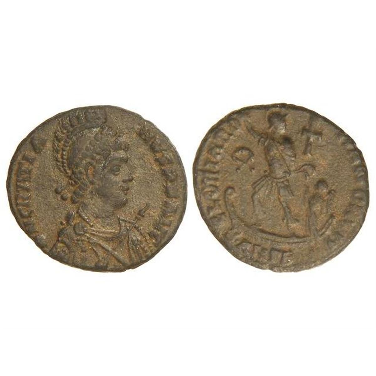 Maiorina. - Acuñada el 367-375 d.C. - GRACIANO. - Rev.: GLORIA ROMANORVM. ANTB. Graciano en pie sobre galera a izquierda, Victoria al timón. 5,20 grs. AE. Pátina oscura. C-25. MBC+. - -