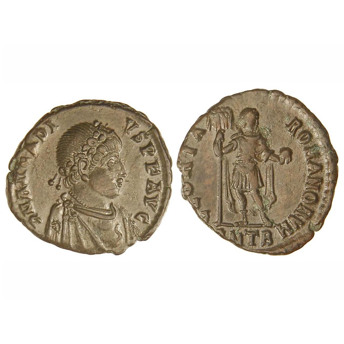 Maiorina. - Acuñada el 388-392 d.C. - ARCADIO. - Rev.: GLORIA ROMANORVM. (A)NT B. Arcadio en pie, cabeza a derecha con estandarte y globo. 4,40 grs. AE. Pátina marrón. S-35. EBC-. - -