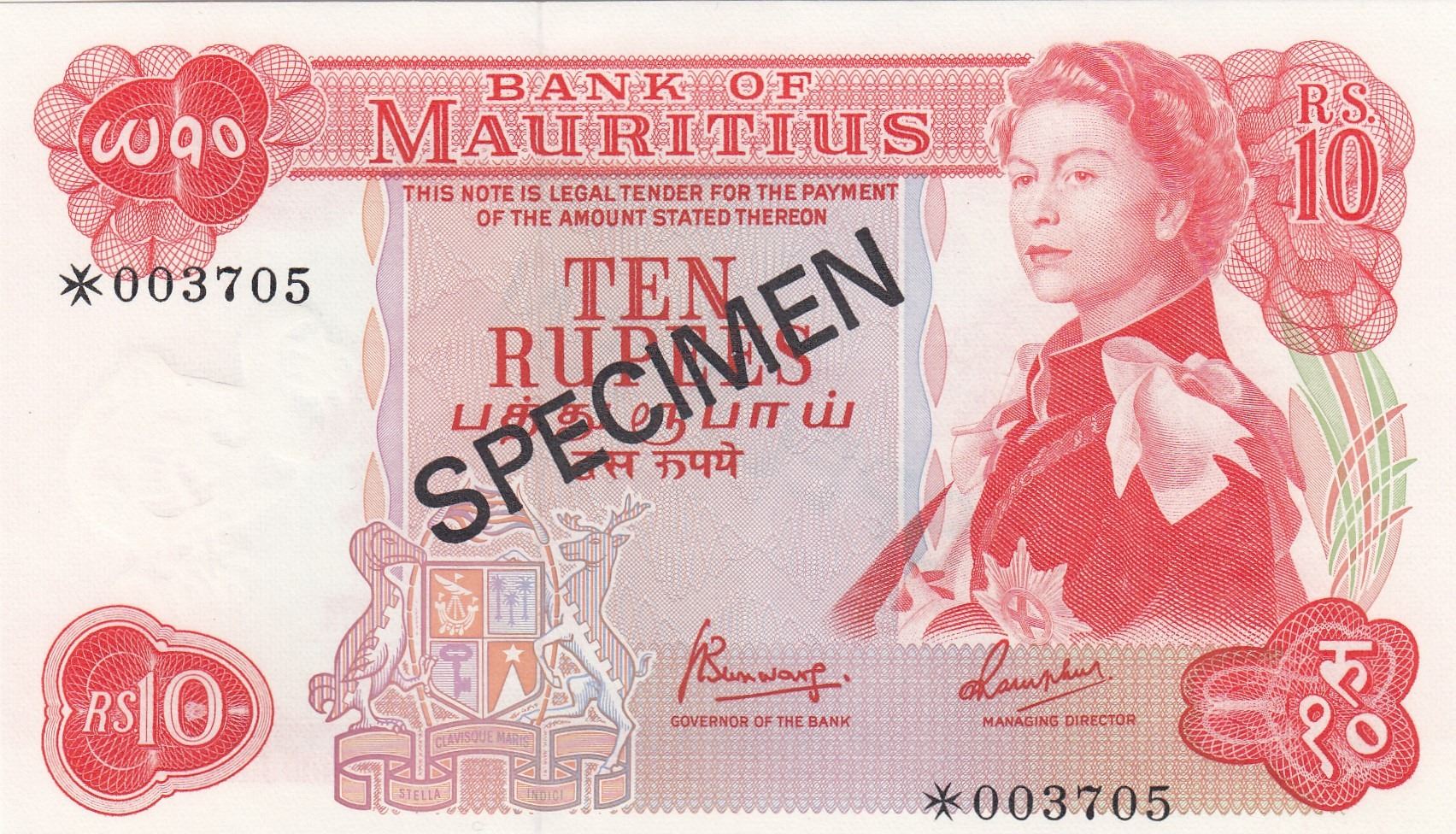 Mairitius, 10 Rupees, 1978, UNC, p31s, SPECIMENbr/Queen Elizabeth II portrait, serial number: *003705