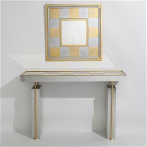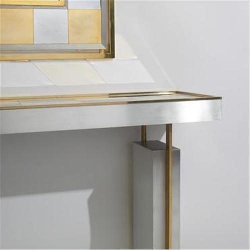 Maison Jansen<BR>console and mirror<BR>France, c. 1963<BR>brass, stainless steel, mirrored glass<BR>51.5 w x 14 d x 33 h inches<BR>Mirror measures: 29.75 w x .75 d x 29.75 h inches<BR><BR>Condition of the item is not included in this description. Condition reports are available from Wright upon request. Wright strongly recommends that you review a condition report for each item on which you plan to bid.