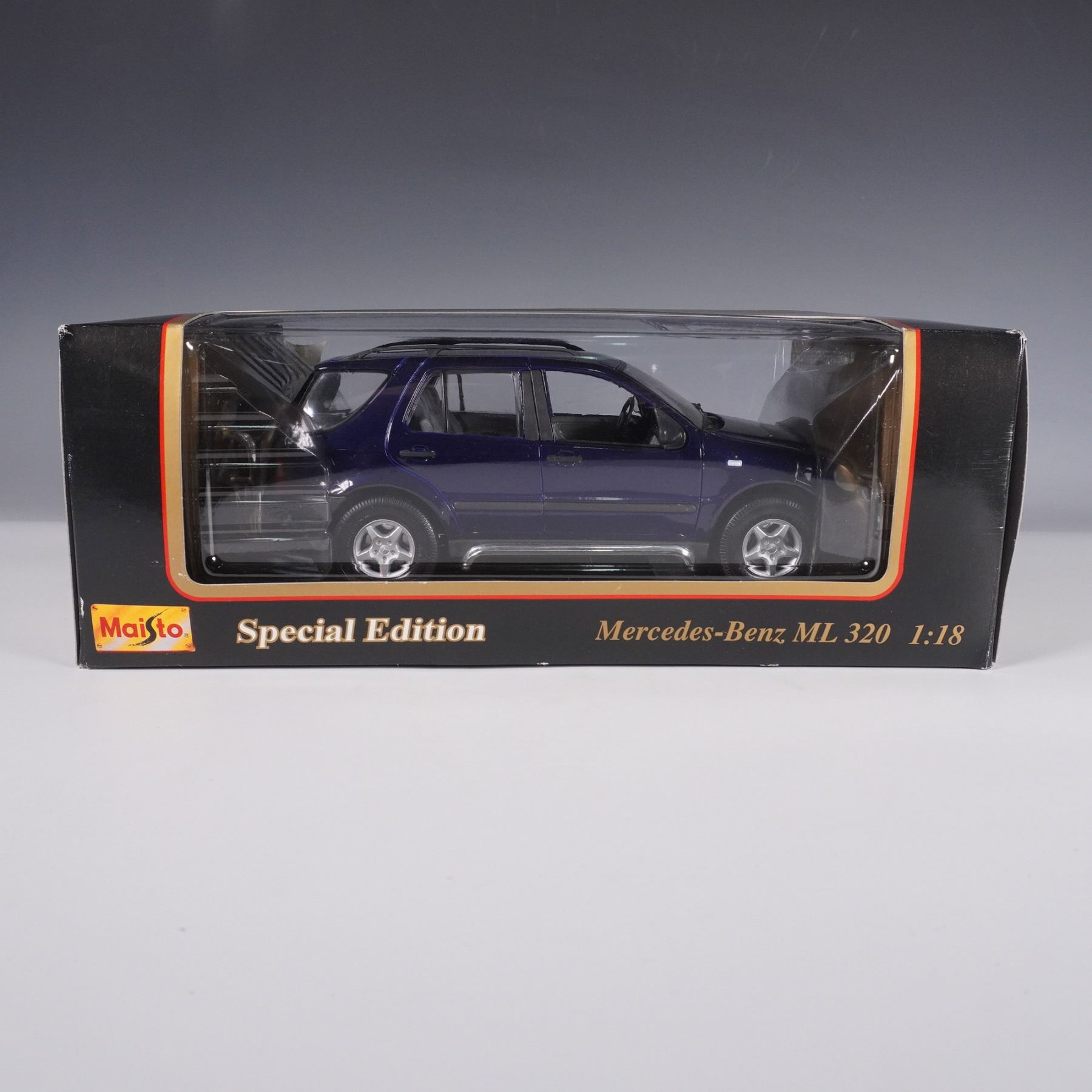 A Maisto 1:18 scale diecast model of the 1997 Mercedes-Benz ML 320, part of the Special Edition series. The model features an intricately detailed deep blue exterior with silver trim, realistic interior, and functional elements such as opening doors, hood, and trunk. It comes mounted on a display base with a plaque and retains its original packaging, which includes manufacturer details and product information. A great addition for diecast collectors and Mercedes-Benz enthusiasts.