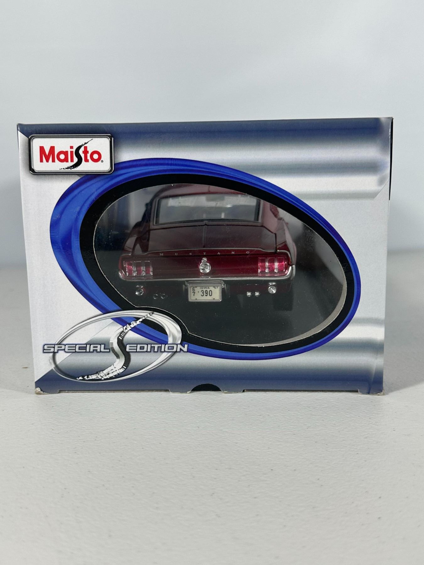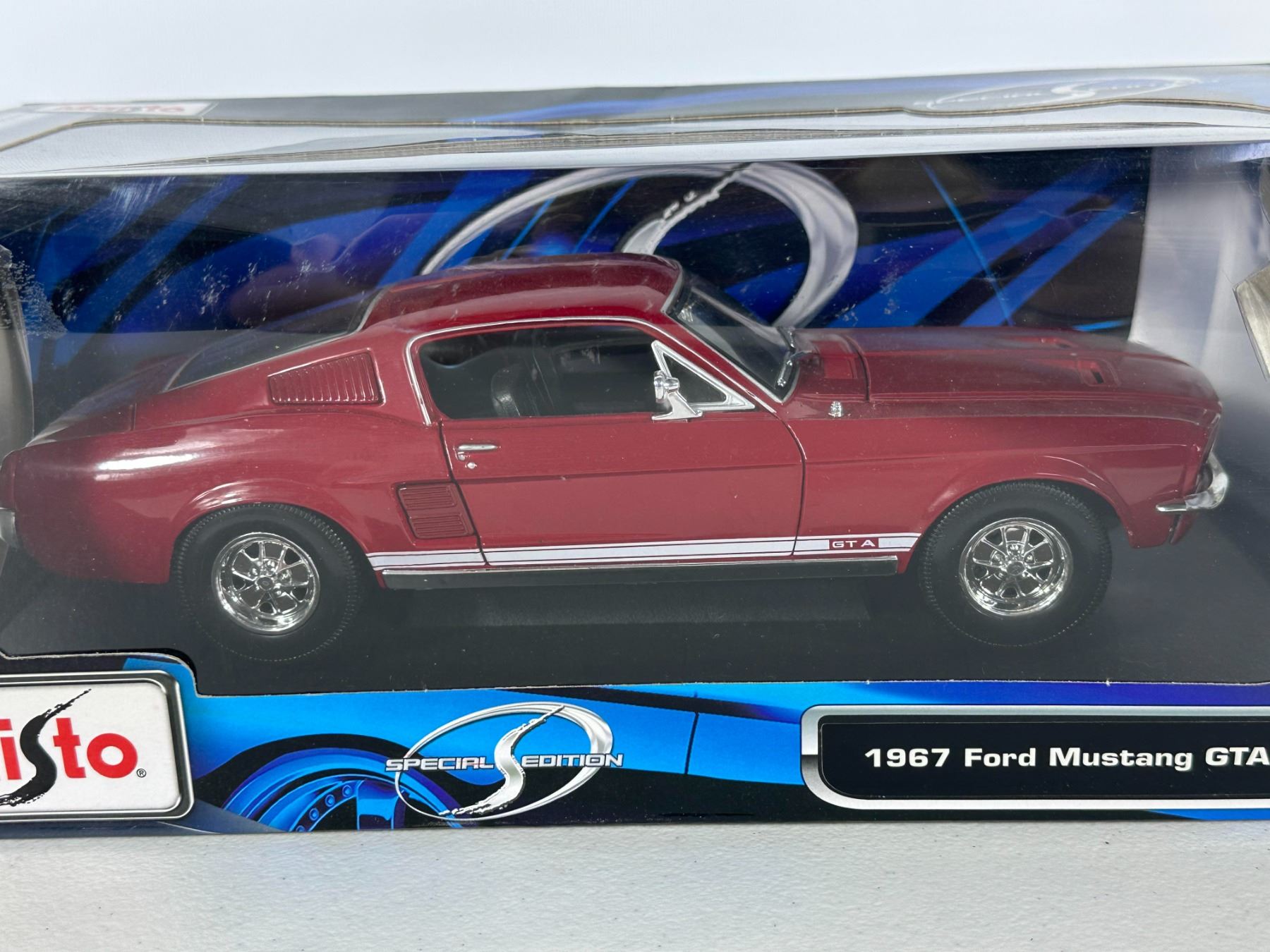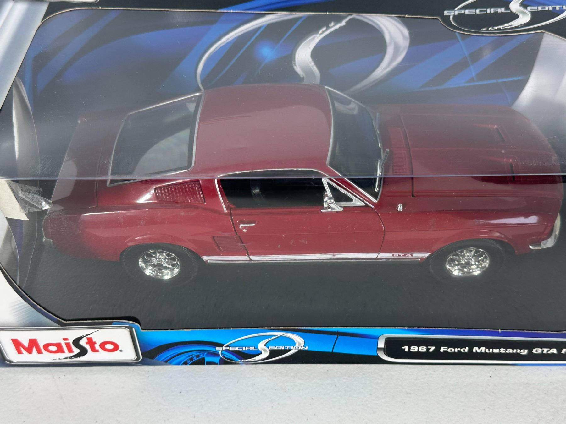 Special Edition Maisto diecast model car of the 1967 Ford Mustang GTA Fastback in 1:18 scale. Detailed exterior and interior. Still in original display box, box shows minor wear. Collectible vintage muscle car model.