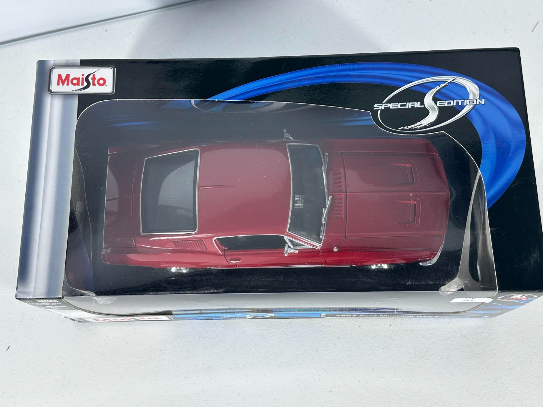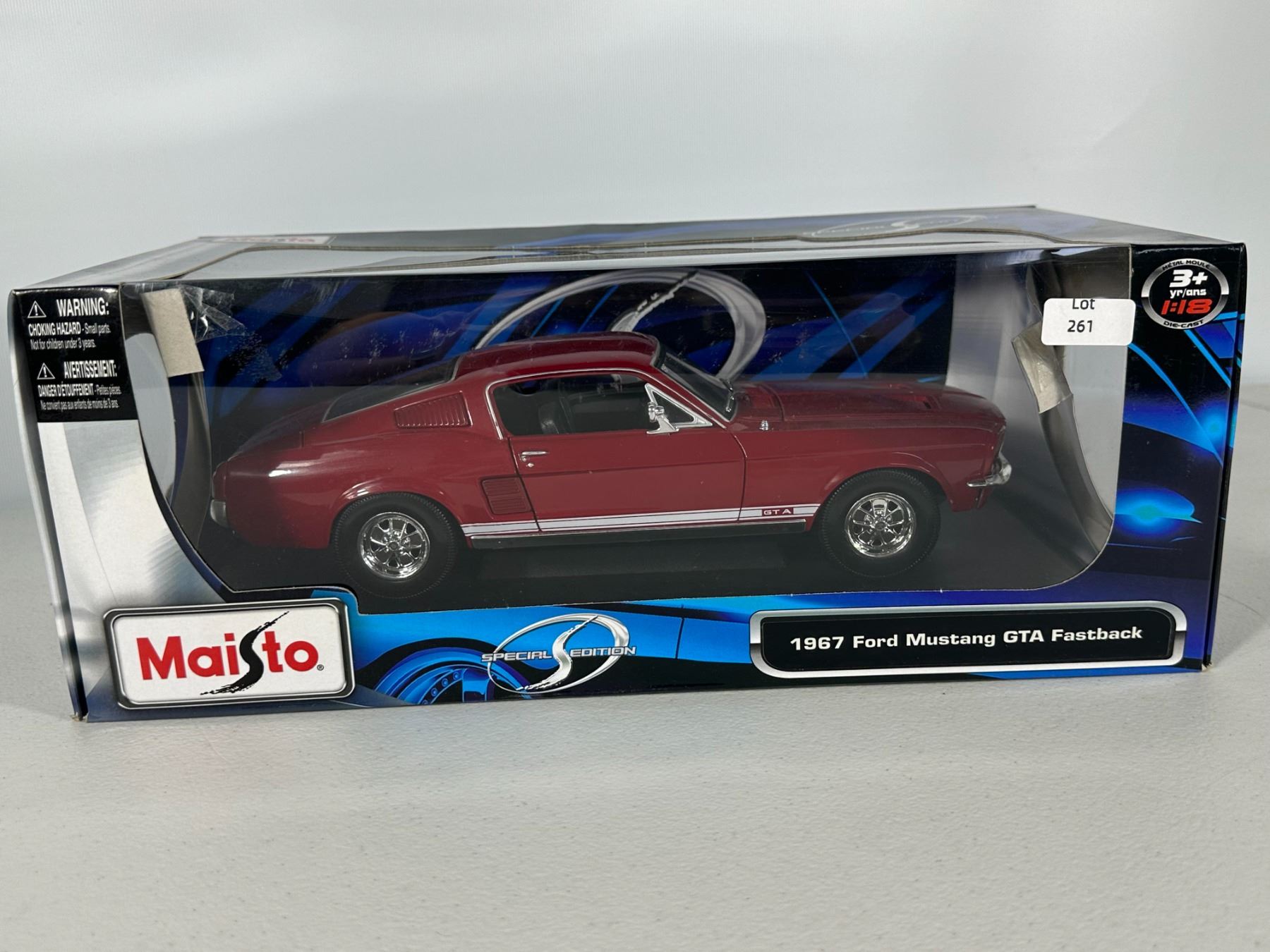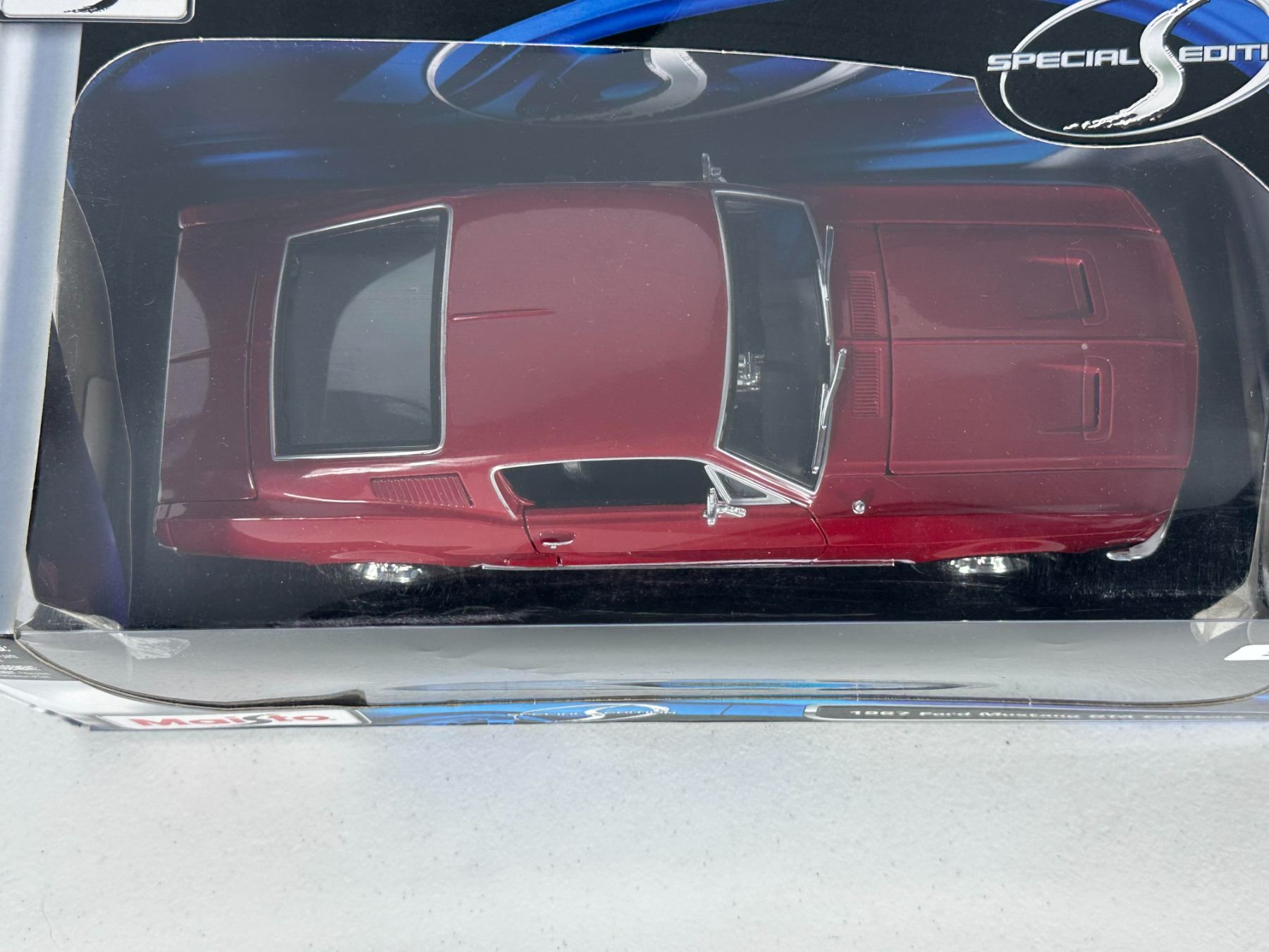 Special Edition Maisto diecast model car of the 1967 Ford Mustang GTA Fastback in 1:18 scale. Detailed exterior and interior. Still in original display box, box shows minor wear. Collectible vintage muscle car model.