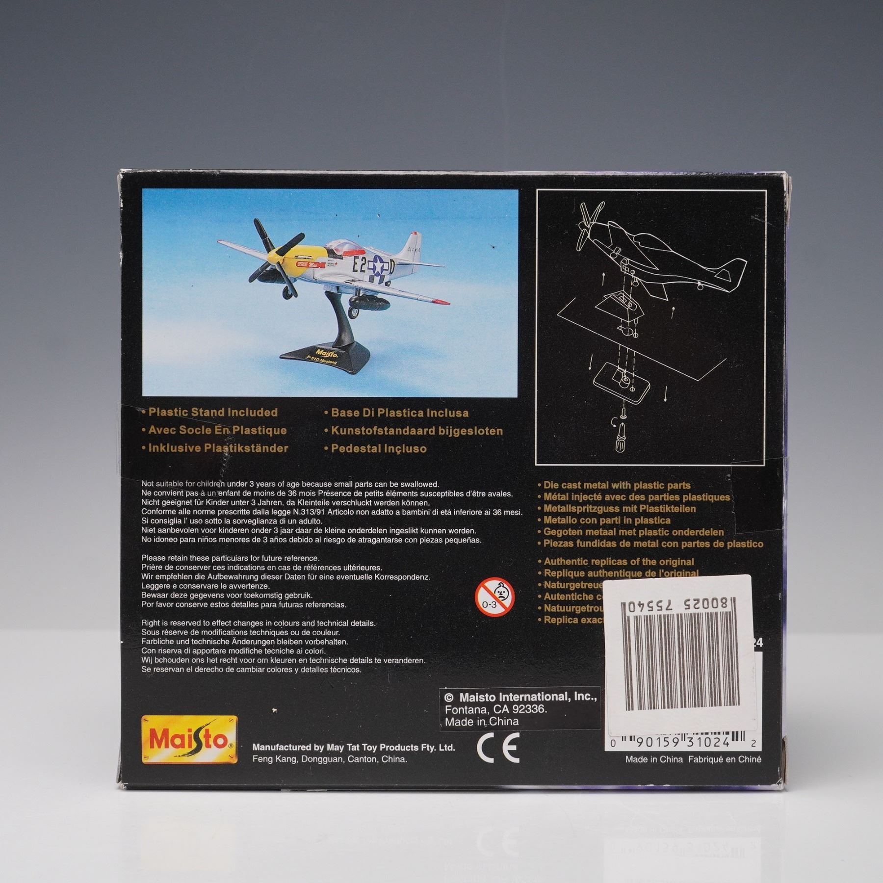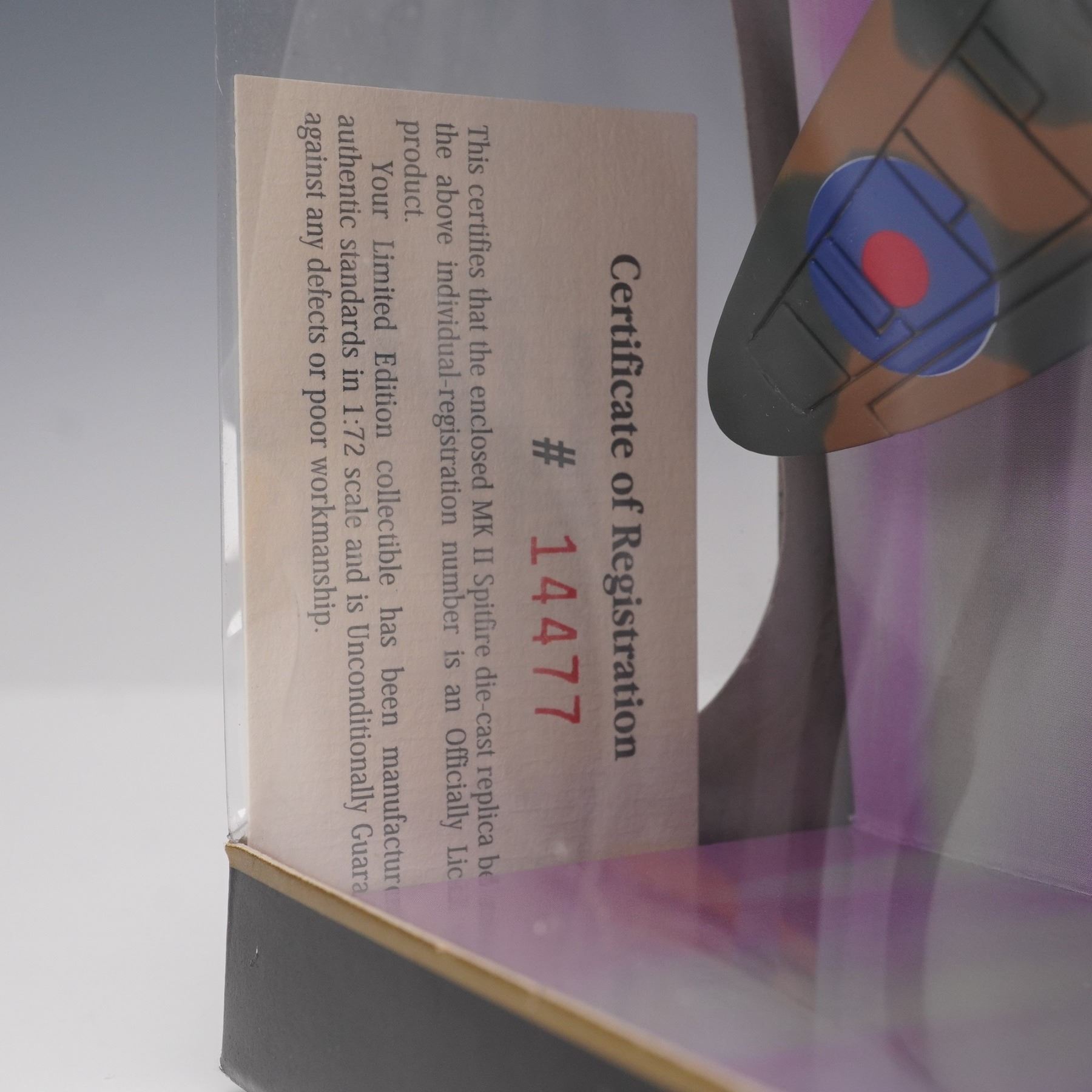 Limited edition MK II Spitfire die-cast model aircraft by Maisto, presented in its original packaging with a Certificate of Registration numbered 14477. This 1:72 scale replica features a camouflage finish with RAF roundels on the wings and fuselage, and a red spinner on the propeller. Includes a display background with a vibrant purple design and a plastic stand for mounting. Made of metal with plastic parts, this collectible is noted for its authentic detailing and craftsmanship. Not suitable for children under 3 years of age due to small parts. Made in China by Maisto International, Inc. Box measures 6.75"L x 3.25"H.