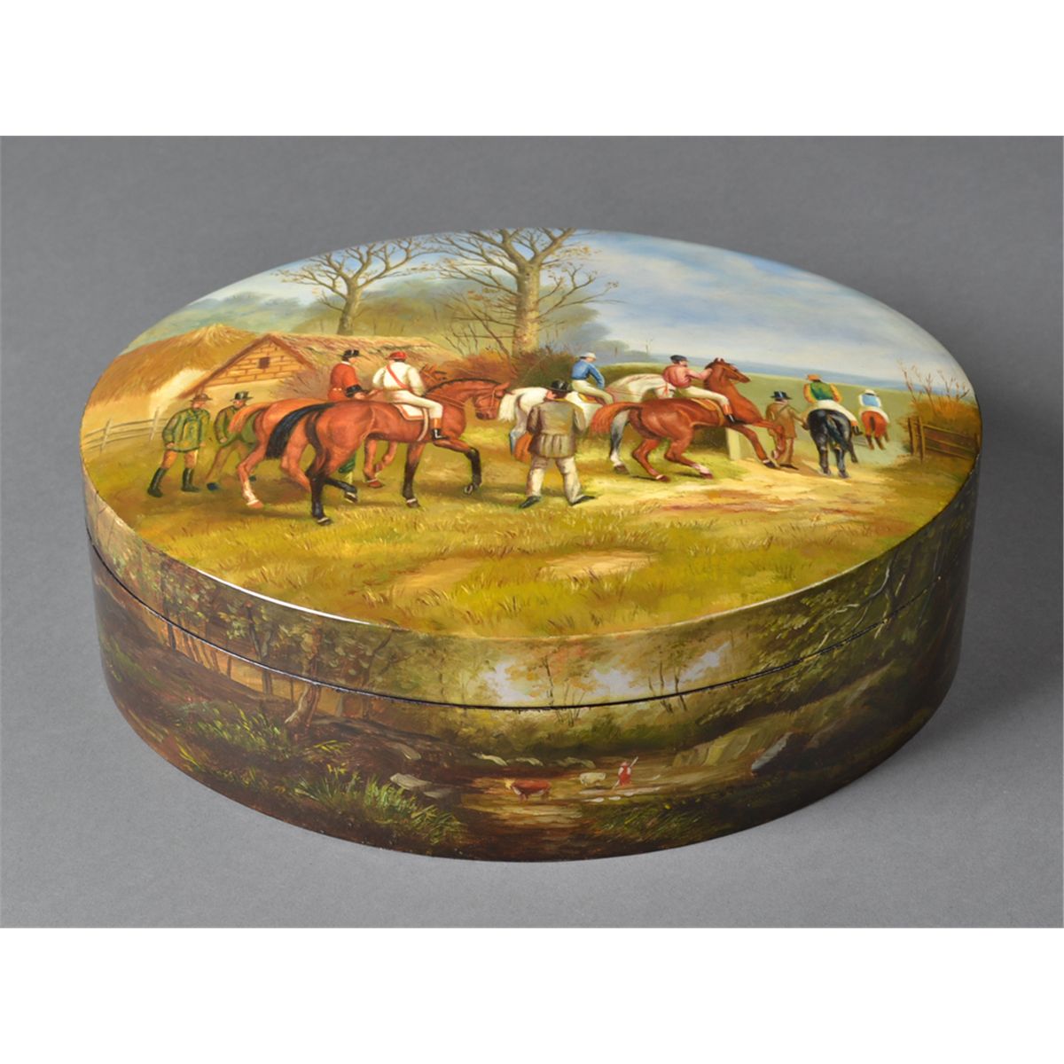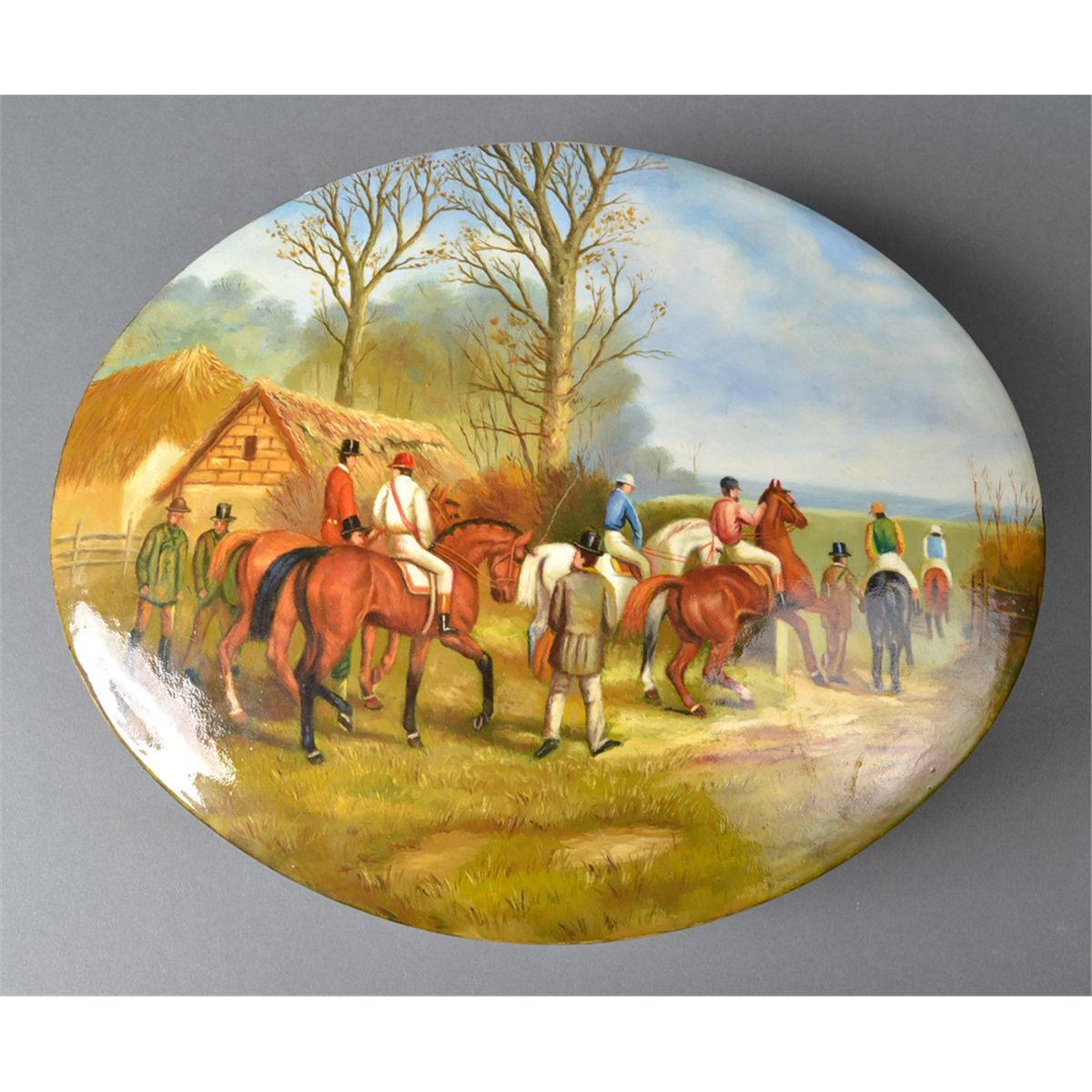 The top hand painted to depict the start of a fox hunt, the sides hand painted to depict figures in a landscape and cows within a pastoral setting. 3.5" H x 11" L. Circa 20th century. Original retail price of $299. Private collection Mt. Christies Estates, Oxford, MI.