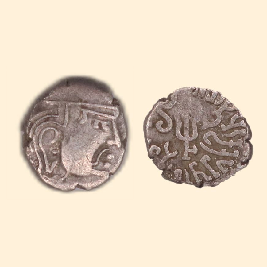 Maitrakas of Vallabhi, ‘Sharva Bhattaraka’ (c. 500-600 AD), Silver Drachma, 1.83gms, OBV: Bust of the king facing right, REV: Trident with Brahmi legend around. (Pieper # 3624). Fine.