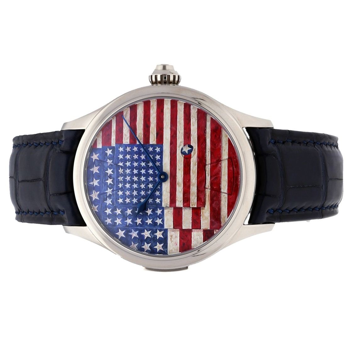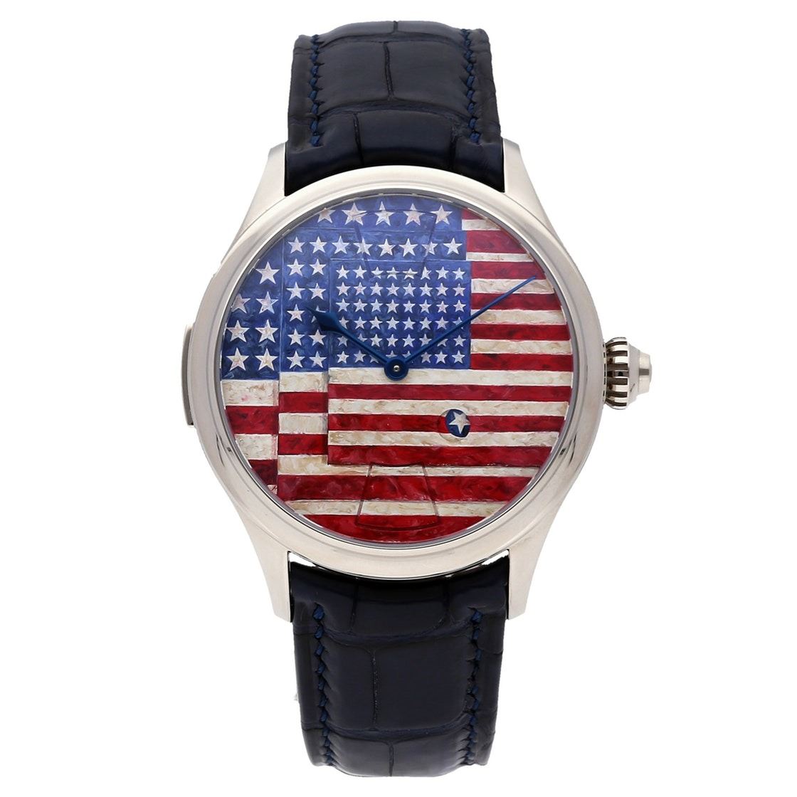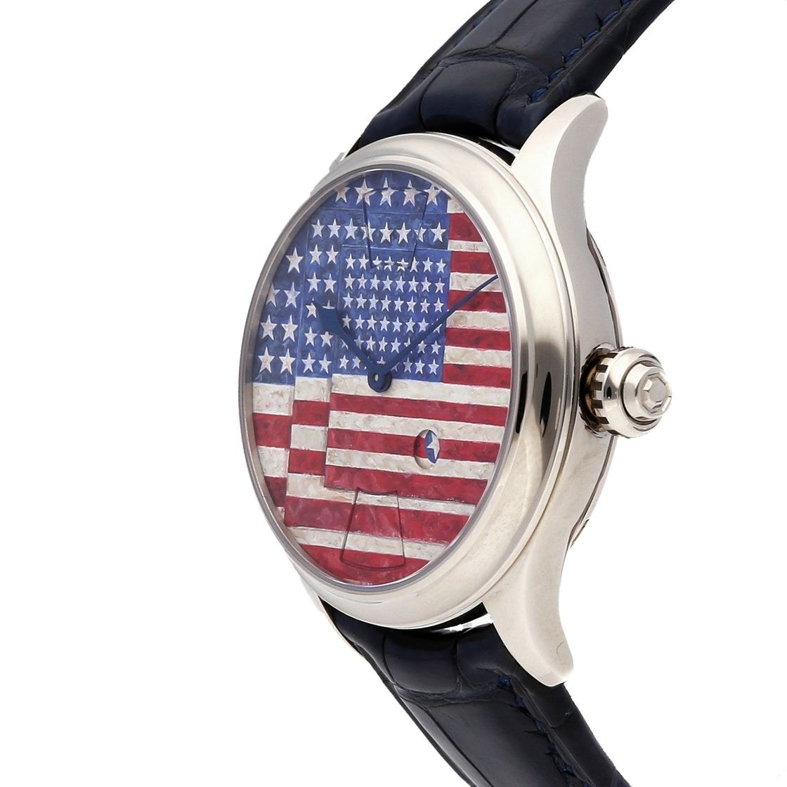 Maitres du Temps Chapter Three Reveal (C3R000080099C3) manual-wind watch, features a 42mm 18k white gold case surrounding a Jasper Johns Three Flags custom painted red, white and blue dial on a blue alligator strap with an 18k white gold tang buckle. Functions include hours and minutes.