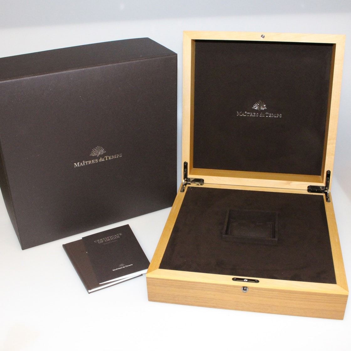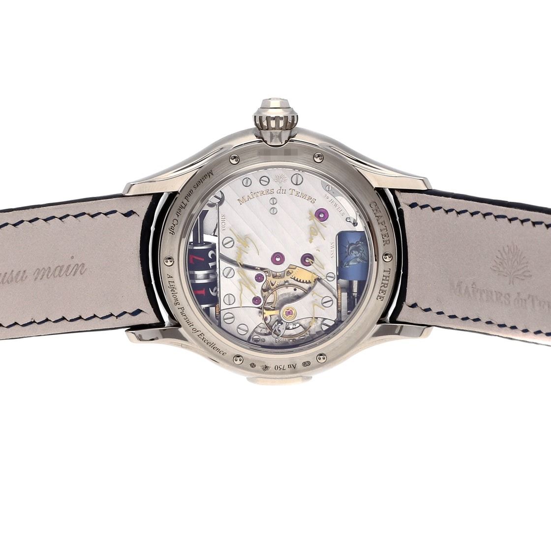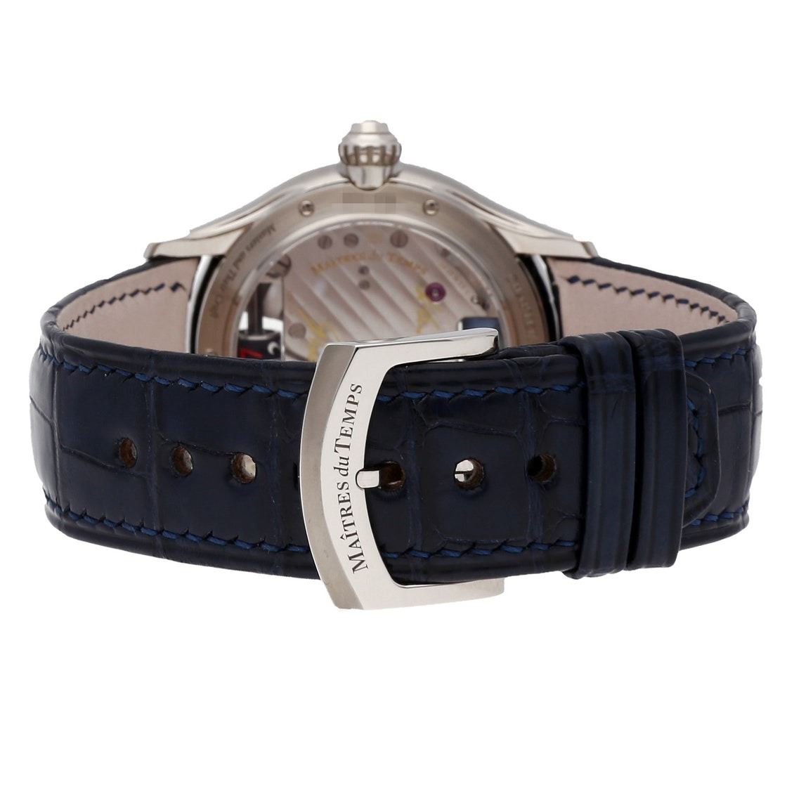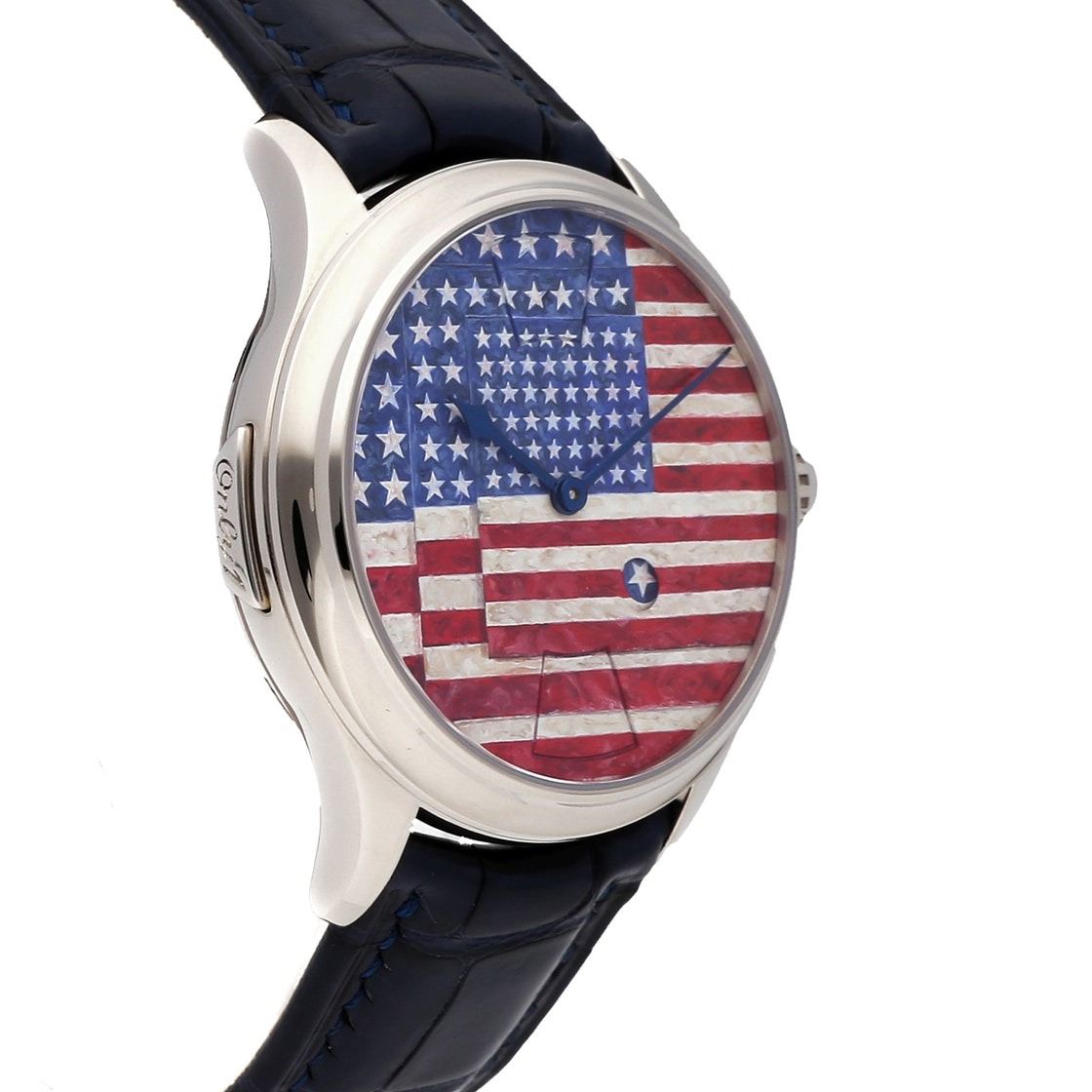 Maitres du Temps Chapter Three Reveal (C3R000080099C3) manual-wind watch, features a 42mm 18k white gold case surrounding a Jasper Johns Three Flags custom painted red, white and blue dial on a blue alligator strap with an 18k white gold tang buckle. Functions include hours and minutes.