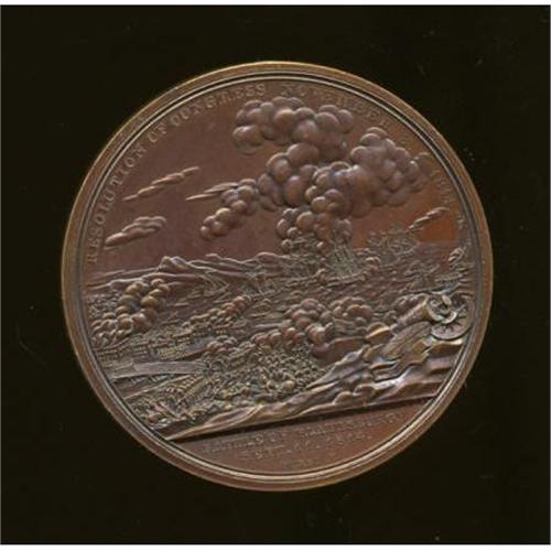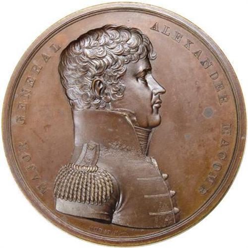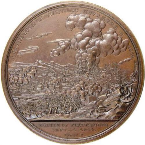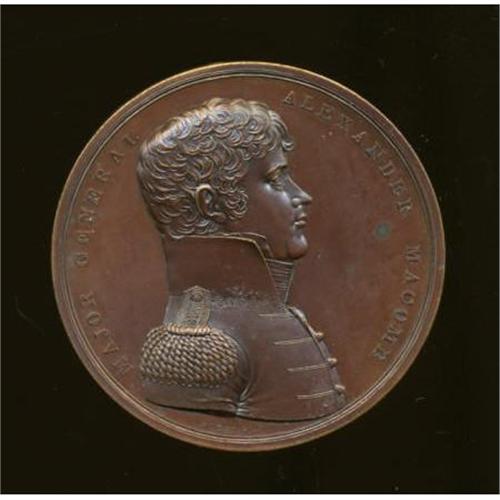<B>Major General Alexander Macomb Military Medal, Julian-MI-16, MS63 NGC.</B></I> Bronzed copper, 65 mm, 134.2 gm. Dies by Moritz Furst. Obverse bust right, legend around MAJOR GENERAL ALEXANDER MACOMB, FURST.F. beneath truncation of bust. Reverse battle scene at Saranac River and Lake Erie naval battle, legend around and in exergue RESOLUTION OF CONGRESS NOVEMBER 3. 1814. BATTLE OF PLATTSBURGH SEPT. 11. 1814., FURST.F. below.<BR> This example offers premium appeal by way of its lustrous brick-red, prooflike surfaces tinged with cherry-red and ice-blue. A couple of stray carbon flecks on the obverse fail to detract. One of 133 copper examples minted, complete with NGC Photo Certificate.<BR><BR><b>Shipping:</b> Coins & Currency (<a target="_blank" href="http://www.heritageauctions.com/common/shipping.php">view shipping information</a>)