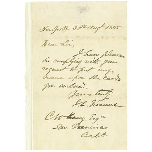 <B>Major General John C. Fremont Autograph Letter Signed,</B></I> “<I>J. C. Fremont,</B></I>” one page, 5” x 8”, New York City, August 30, 1885, to C. W. Casey, San Francisco, California. The letter reads, “<I>I have pleasure in complying with your request to put my name upon the card you enclosed.</B></I>” Some light soiling, old mounting tape along left margin. Excellent signature, very good condition.<BR>John C. Fremont (1813 - 1890) a career soldier; he explored the far West and served as a U.S. Senator from California. The talented Fremont would earn further distinction in 1856 by becoming the Republican Party's first presidential candidate.<BR><BR><b>Shipping:</b> Flat Material, Small (<a target="_blank" href="http://www.heritageauctions.com/common/shipping.php">view shipping information</a>)