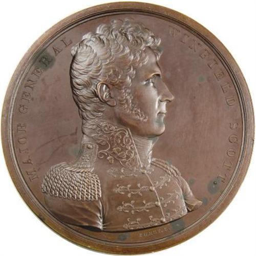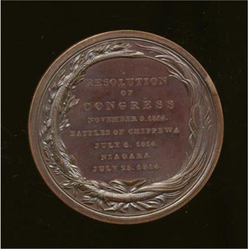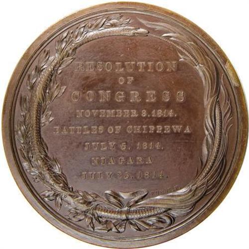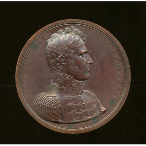 <B>Major General Winfield Scott Military Medal, Original Dies, Mint State Uncertified.</B></I> Bronzed copper, 65 mm. Dies by Moritz Furst. Obverse bust right, legend around MAJOR GENERAL WINFIELD SCOTT, FURST.F. below truncation of bust. Reverse wreath intertwined with a serpent biting its own tail, RESOLUTION OF CONGRESS NOVEMBER 3. 1814. BATTLES OF CHIPPEWA JULY 5 (punched over a 4). 1814. NIAGARA JULY 25. 1814.<BR> This medal comes with an NGC nongrade sticker attesting "Corrosion" which is noted almost exclusively on the obverse, and the reverse is choice, with a bit of rim breaking at 2 o'clock. Julian notes that "Furst was paid only $450 for these dies, which do poor homage to Scott. He deserved at least as fine a medal as received by the other military men. ... The original reverse may be identified by noting that the 5 of JULY 5 is over a 4. This was seen on a medal in the John Ford, Jr. collection." That Ford medal, Uncirculated, brought $650 (Stack's, Sale VII, 1/2005, lot 381), although it does not show the rim break of the present piece, which is further advanced in die state. This is a similar piece otherwise, also clearly from the original dies. Another example, Choice AU, in the famous Kessler-Spangenberger sale (NASCA, 4/1981, lot 1673) brought $110.<BR><BR><b>Shipping:</b> Coins & Currency (<a target="_blank" href="http://www.heritageauctions.com/common/shipping.php">view shipping information</a>)