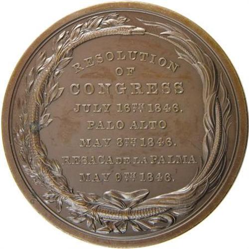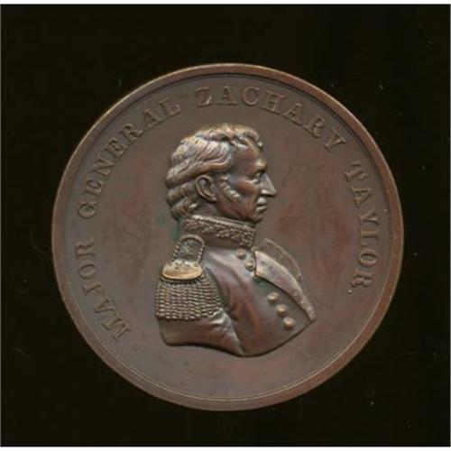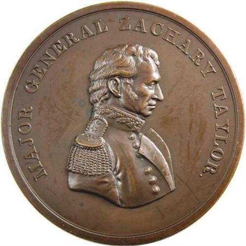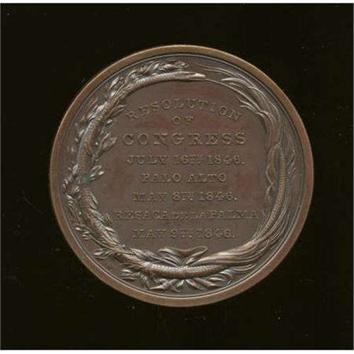 <B>Major General Zachary Taylor Medal, Julian-MI-22, MS63 NGC.</B></I> Bronzed copper, 65 mm. Obverse die by John T. Battin, reverse die by Moritz Furst. Obverse bust right, legend around MAJOR GENERAL ZACHARY TAYLOR, unsigned. Reverse serpent biting its tail intertwined with a wreath of laurel and palm, central inscription RESOLUTION OF CONGRESS JULY 16TH 1846. PALO ALTO MAY 8TH 1846. RESACA DE LA PALMA MAY 9TH 1846. Julian notes, "[U.S. Mint] Director Patterson suggested the use of the wreath reverse and even was responsible for the reverse wording. It is ironic to note that the particular wreath on the reverse had earlier been used on the 1812 Scott medal and showed some rather poor judgement on the part of mint officials. To use the old reverse from a medal struck for the leader of the other American army in Mexico (Scott) is, at best, strange."<BR> The present example boasts appealing medium-brown surfaces with good luster and some scattered flecks of carbon. Comes with NGC Photo Certificate.<BR><BR><b>Shipping:</b> Coins & Currency (<a target="_blank" href="http://www.heritageauctions.com/common/shipping.php">view shipping information</a>)