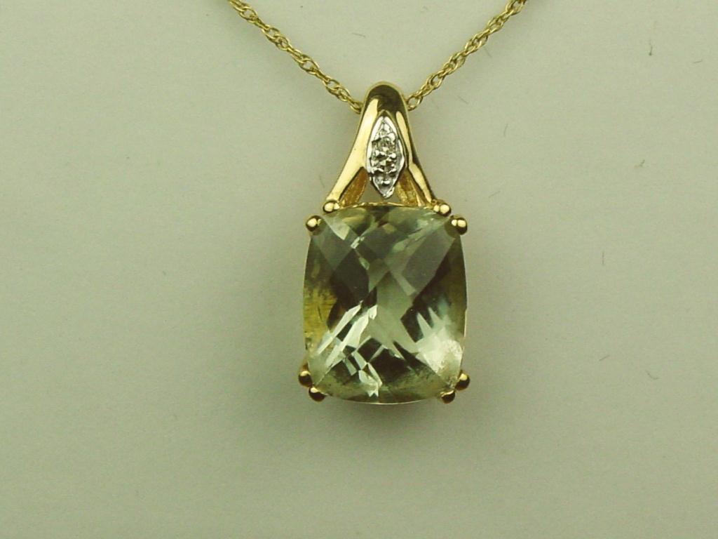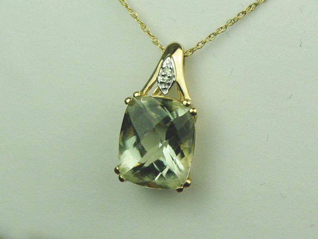 Majestic 10K 2-Tone Gold Necklace Set with a large checkerboard cut green Amethyst weighing over 5.00 carats and side diamonds. Retail: $995.00Set with a large checkerboard cut green Amethyst weighing over 5.00 carats and side diamonds. Retail: $995.00
