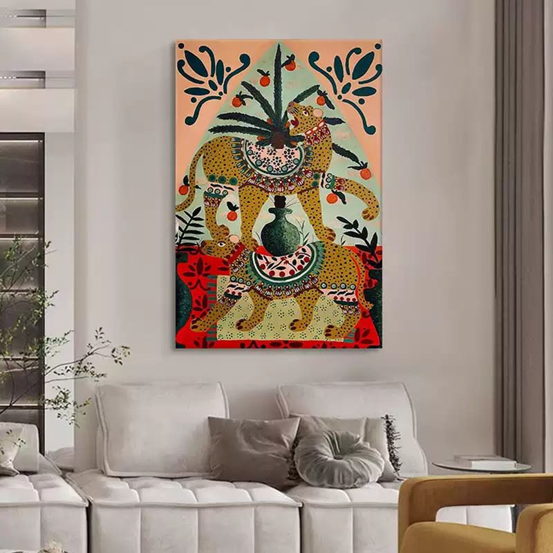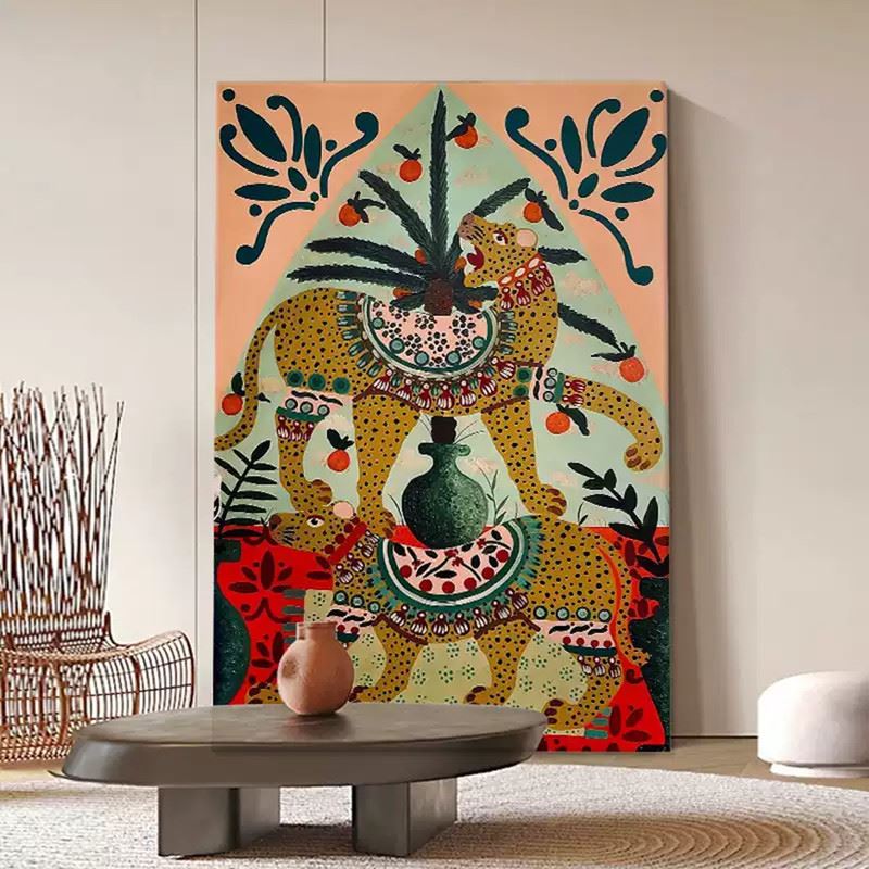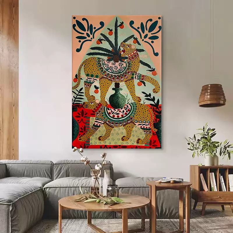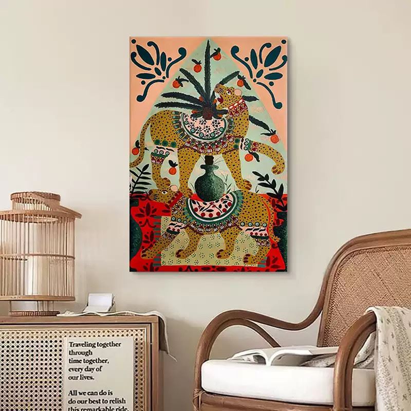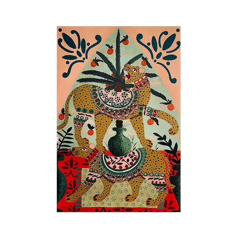 This vibrant and whimsical artwork features two majestic lions, adorned with intricate patterns and symbols, positioned in a dynamic and harmonious composition. The lions are surrounded by elements of nature—palm trees, fruits, and plants—suggesting a deep connection to the earth. The bold color contrasts, with bright oranges, greens, and reds, create a sense of vitality and strength. The intricate patterns on the lions' bodies and the stylized plants evoke a sense of cultural richness and timelessness, celebrating both nature and artistic expression. Dimensions: 24 x 35 inches.