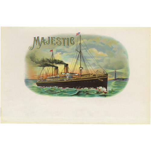 <B><I>Majestic</B></I></B></I><B> Nautical Cigar Label.</B></I> Full color lithographed 10" x 6.5" inner label with gold-embossed highlights. Steaming across the paper is the S.S. <I>Majestic</B></I> of the White Star Line. An early luxury liner, this vessel joined White Star's fleet in 1890 and for a time held the speed record for crossing the Atlantic. For a number of years, commencing in 1895, she was captained by Edward J. Smith of <I>Titanic</B></I> fame. A splendid lithograph that should appeal to maritime historians as well as to cigar label collectors. Near mint. This label is listed as one of the "InStone 100" blue chip cigar labels.<BR><BR><b>Shipping:</b> Small Flat (<a target="_blank" href="http://www.heritageauctions.com/common/shipping.php">view shipping information</a>)