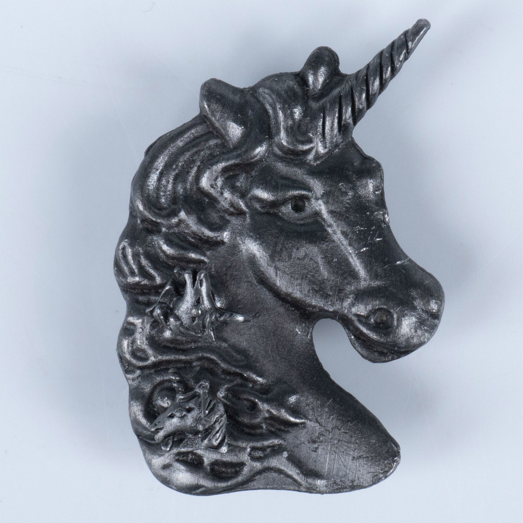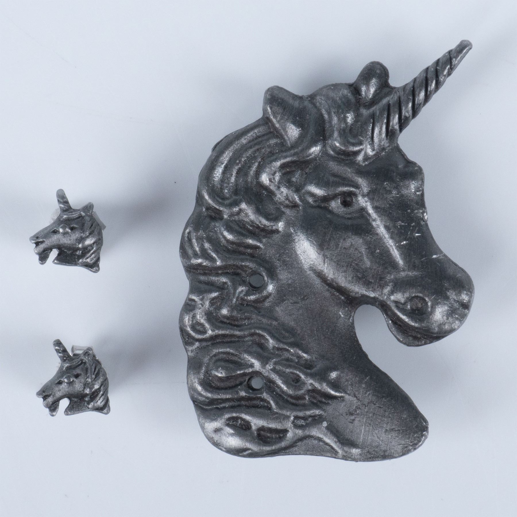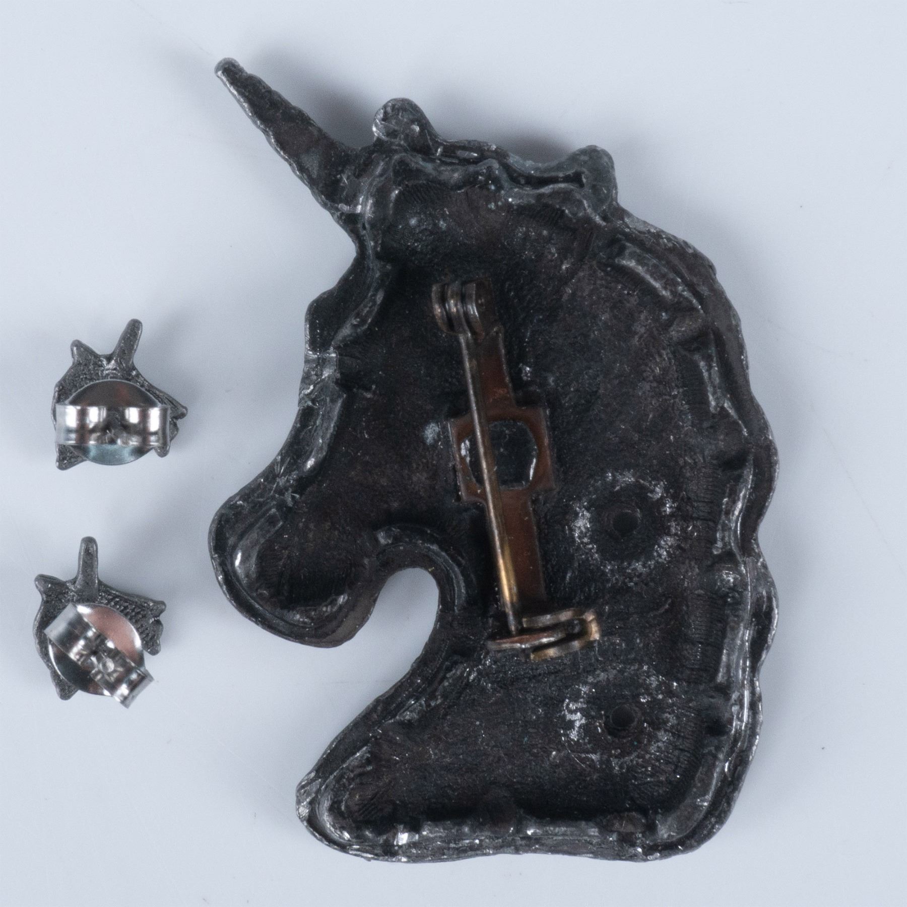 Cute pewter unicorn pin and matching stud earrings for pierced ears. The brooch measures approximately 1.75"L x 1.5"W. The earrings measure approximately 0.25"L x 0.25"W.
