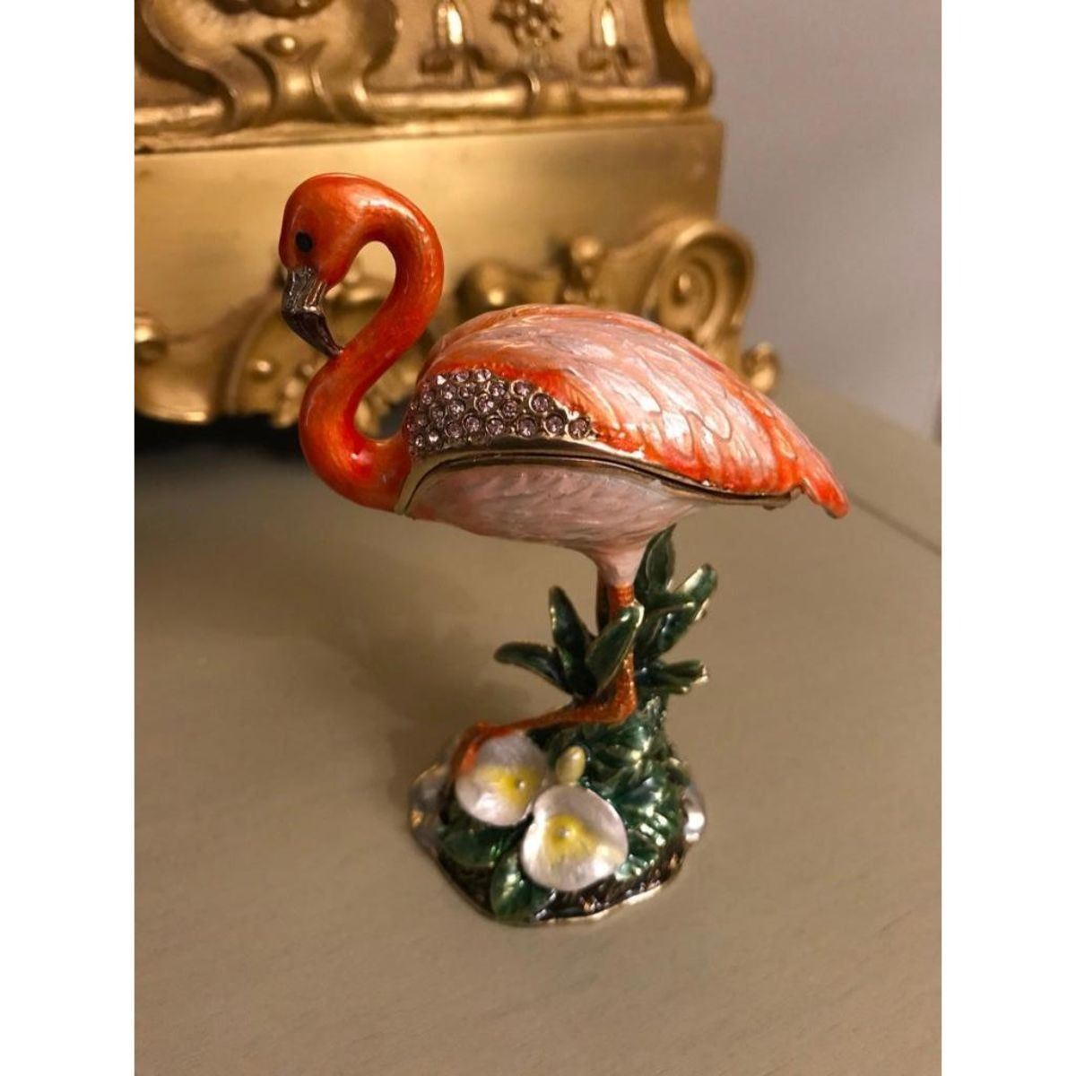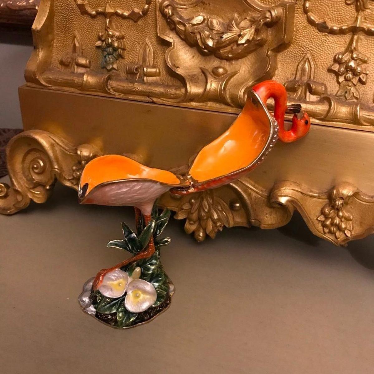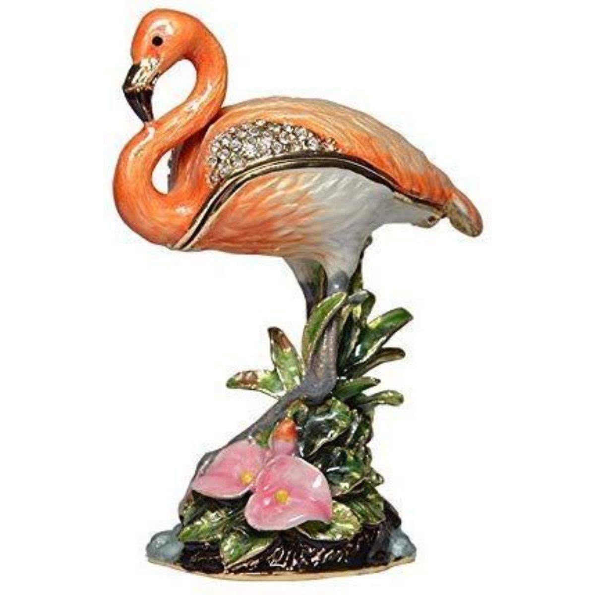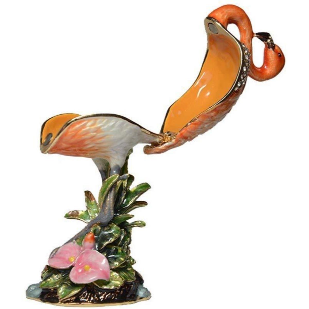 Majestic Pink Flamingo, bird theme trinket, jewel box. Opens at center on a hinge, with magnetic closure, to reveal an enameled hiding place for jewels or trinkets. Hand-painted orange & pink enamel main colors, with gold gilt over pewter & embedded Austrian crystals. A lovely piece. 4"H X 3" L X 1 5/8" W. Comes with gift box.
