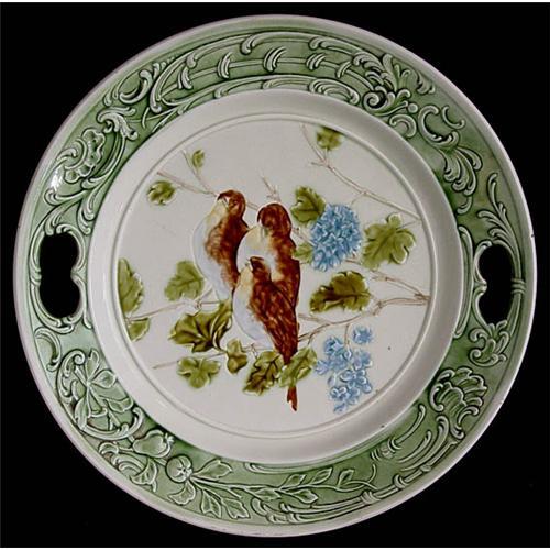 <table width="100%" border="0" cellspacing="0" cellpadding="4"><tr><td><em> </em></td></tr><tr> <td width="100%"> Beatiful Majolica / Barbotine wall or cabinet display plate with two handles, green border and center panel depicting birds all in relief. Barbotine is a colorful French faience decorated in relief made between 1870 and 1930. Barbotine is also a word used to refer to French Majolica. Marked on the base as shown. Comes wired and ready to hang from the wall. In very good condition with small scratches and minor signs of wear consistent with age. Please ask questions, request additional photographs and shipping costs before bidding.