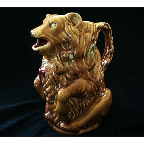<table width="100%" border="0" cellspacing="0" cellpadding="4"><tr><td><em> </em></td></tr><tr> <td width="100%"> Detailed majolica bear pitcher, holding a stick and with a collar. The handle is a twisted vine. It is 8.5" tall. In excellent condition. The bottom shows signs of age and is partially glazed. Marked with J G and the numbers 126. While I have not seen this mark, there is reference to the initials J G being used without the crescent by George Jones of England from 1861-1872.