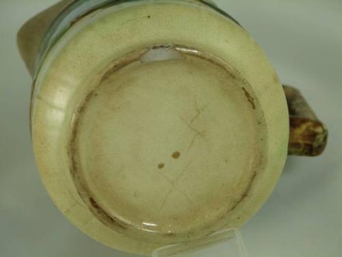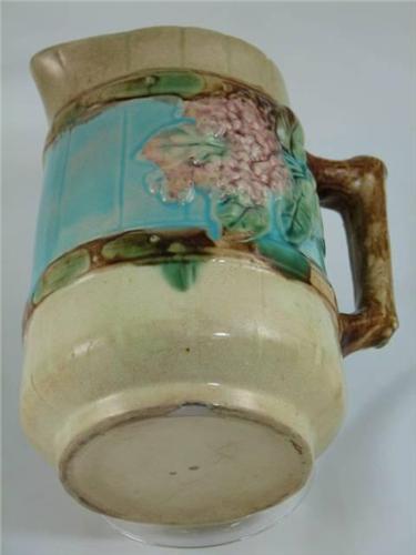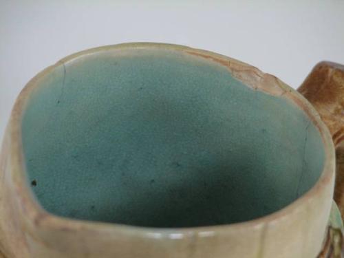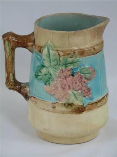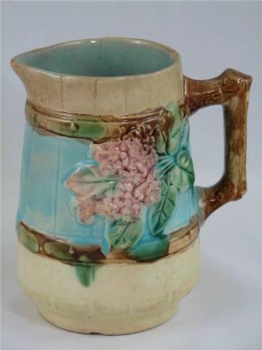 Antique majolica creamer pitcher with raspberries repeated on both sides, on an aqua background on a yellow barrel and stave look pitcher with a brown branch handle. The inside is also aqua and shows one chip on inner rim and has two hair line cracks, these flaws are not visible on the outside. Also one chip on bottom rim - see photos. Unmarked, manufacturer unknown. This majolica creamer is 5.75" tall by 4" diameter.