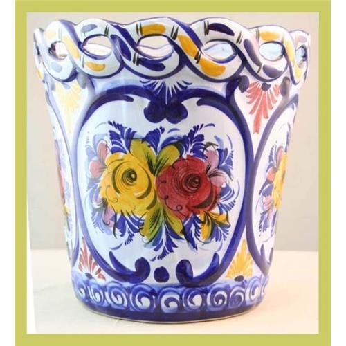 </STRONG>Title: 1950 Portuguese Majolica Flower Pot Hand-Painted</STRONG><P>Item #: 4-354-0</P><P>Dimensions (in.): 9.75W 9.75D </P><P>Age (ca.): 1950</P><P>Origin: Portugal</P><P>Style: Majolica</P><P>Material: Ceramic</P><P>Object: Flower Pot</P><P>Additional Detail 1: Hand-Painted</P><P>Piece Type: Ceramics & Porcelain</P>Portuguese Hand-Painted Flower Pot Majolica Ceramic