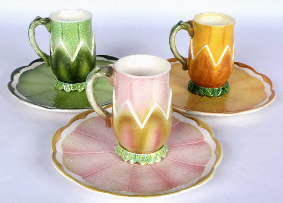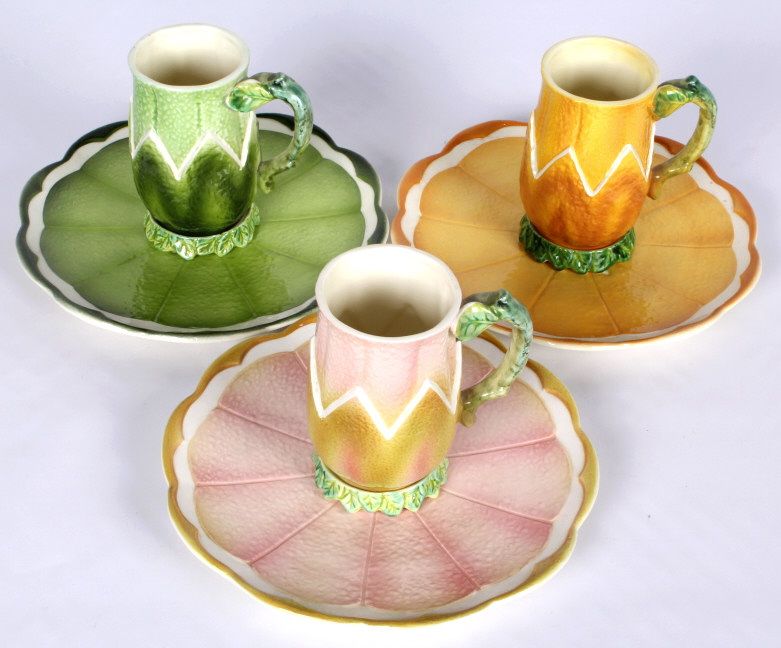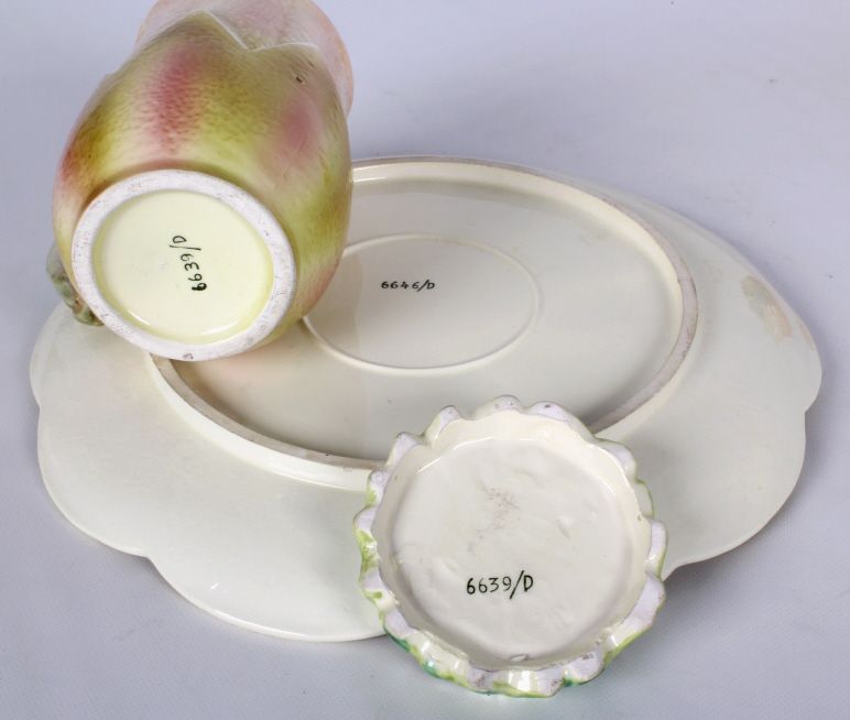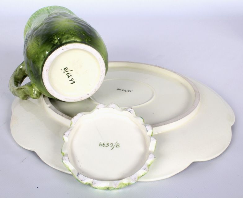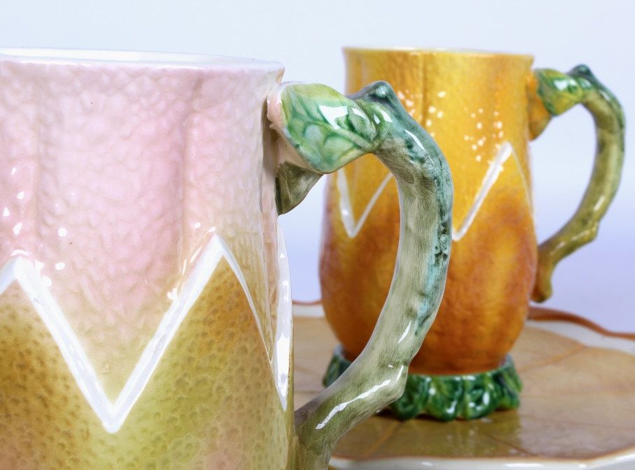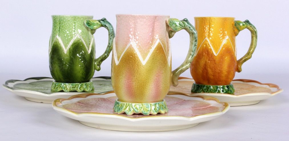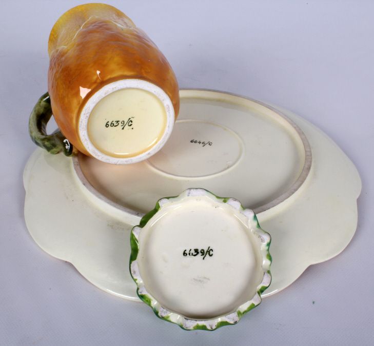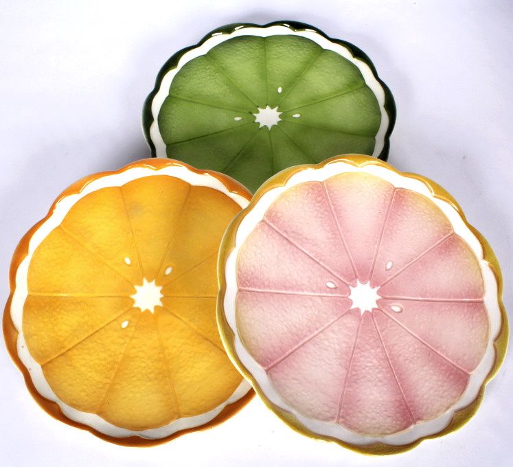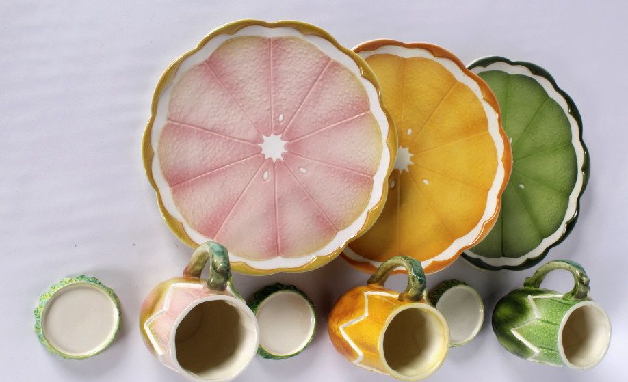 These are all hand painted and features a set of 3. Each set includes a Mug with the fruit and leaf motif, a coaster in the shape of leaves, and also plates with the appearance of the sliced fruit such as a Grapefruit, Orange, and a Lime. Each saucer, coaster, and cup have matching numbers on the bottom corresponding each fruit type.