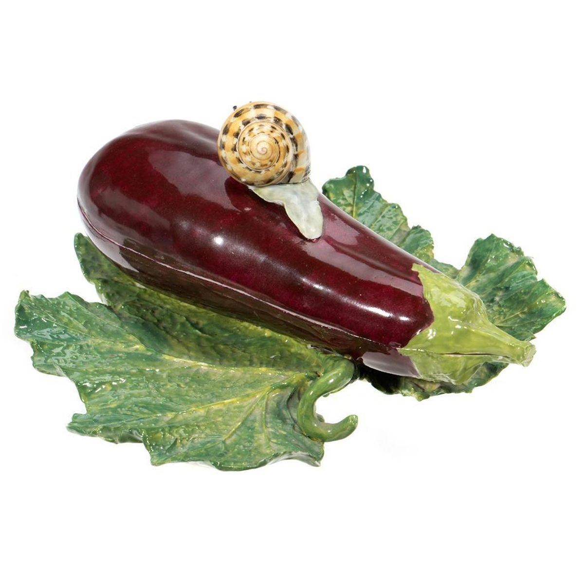 In the form of an eggplant on leaf with snail finial. 4in. H 8in. Condition: chip to one snail horn and edge of leaf