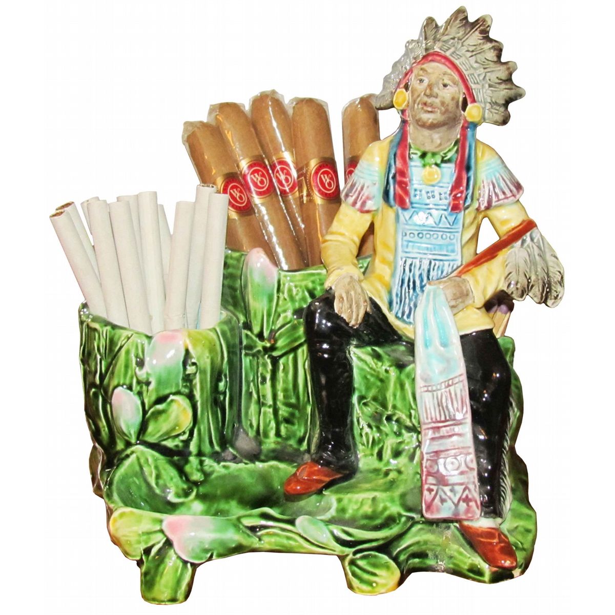 Majolica Smoking Station Native American Motif. Tiny chip bottom right edge otherwise excellent condition. 6 3/4 X 8 1/4 X 5 3/4 inches.