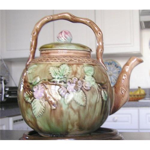 Very rare, beautiful Victorian Majolica Teapot. Excellent condition, with three small dings on the inside rim of the lid as shown in the illustration. The pot, with its lid, is eight and one half inches tall, and eight inches across. Circa 1900.