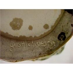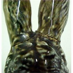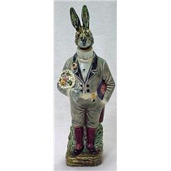 Majolica standing rabbit decanter, in coat tails holding bouquet, damage to head, (cork replaced with wooden dowel), impressed signature on base G. Selthausen, 13 3/4" high Estimate 80/150