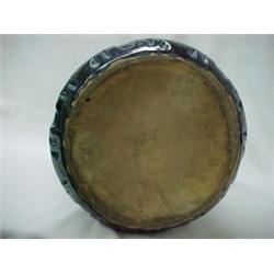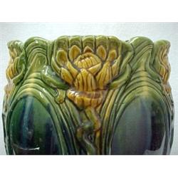 Majolica type pottery umbrella stand, with green, yellow, and cobalt blue gloss glaze on raised Art Nouveau decoration, early 20th C. 21" high x 10" diameter Estimate 100/200