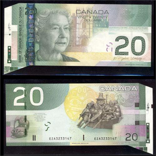 Major "Cutting" ERROR NOTE. 2004 $20 EZA3233147 Large extra piece attached at bottom and left hand side showing the colour bars. Rare and seldom seen! AU.