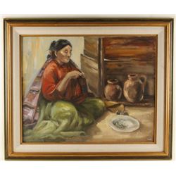 Depicting a Native American woman that is seated while stringing blue beads from a dish in front of her. Deceased Idaho artist, gallery priced at $280