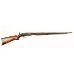 Blued pump-action take-down rifle with a 23-7/8" barrel. Metal finish is faded to brown/grey with edge wear, a few dings and pitting on the but...