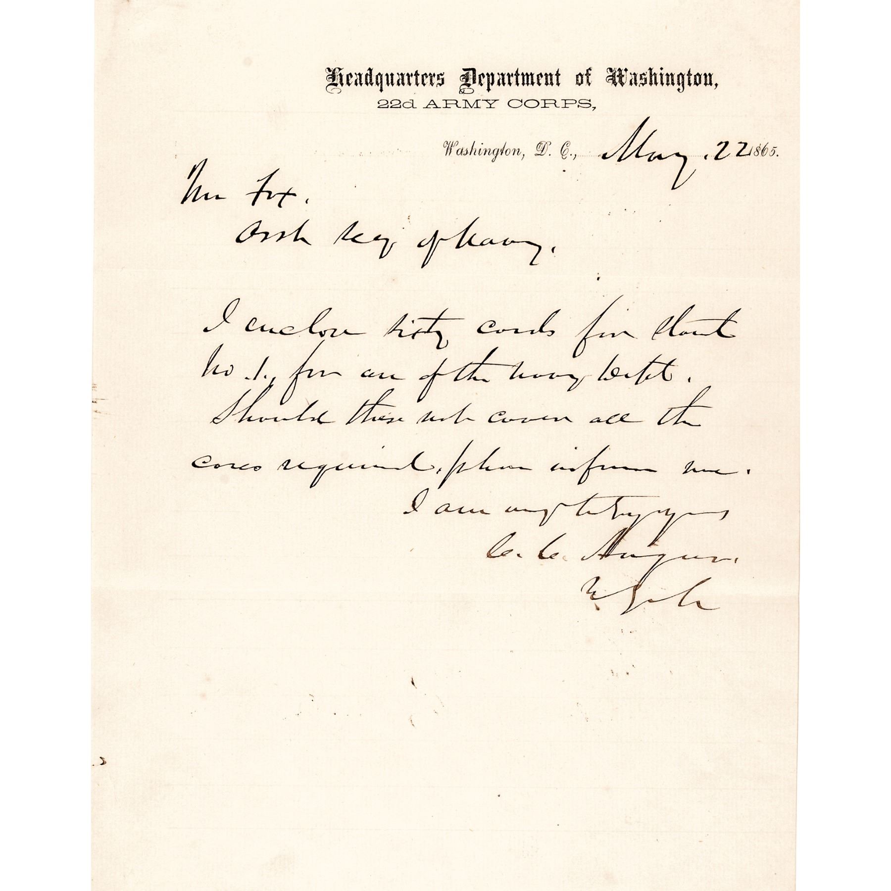 May 22, 1865-Dated Civil War Period Autograph Letter Signed, "C.C. Augur", 1 page, 7.5” x 9.75”, Headquarters Department of Washington, 22d Army Corps, Washington, D.C., Choice Extremely Fine. Written on 22nd Army letterhead to Mr. (Gustavus) Fox, Asst. Sec. of the Navy. Some light ink spots and typical folds, otherwise excellent condition. Dated just a few weeks after the surrender at Appomatox. This rare letter reads in full: