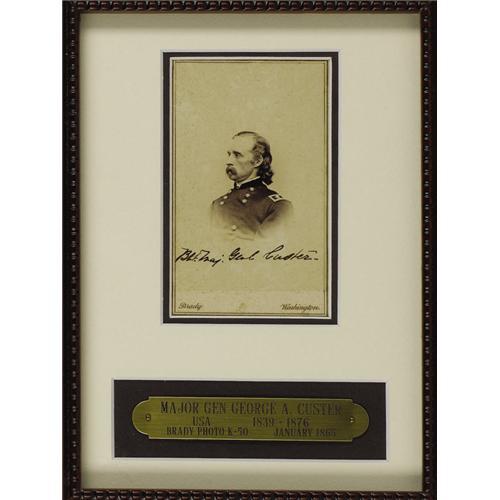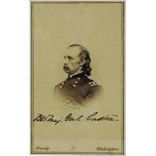 <B>Major General George A. Custer <I>Carte De Visite</B></I>,</B></I> by Matthew Brady & Co., New York, January 3, 1865. Framed with a custom brass nameplate to an overall size of 8” x 10”. Inscription on lower portion of the image naming the subject. Very fine condition.<BR><BR><b>Shipping:</b> Miscellaneous Collectibles, Smal (<a target="_blank" href="http://www.heritageauctions.com/common/shipping.php">view shipping information</a>)