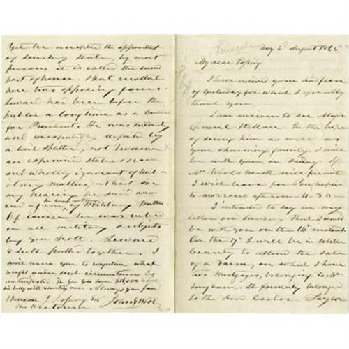 <B>Major General John E. Wool Autograph Letter With Excellent Political Content Signed</B></I> “<I>John E. Wool</B></I>”. Four pages, 5” x 8”, Troy, New York, August 2, 1865, to Benson J. Lossing, the Historian. In this letter the former Civil War general delivers stinging criticisms against William Seward, General Winfield Scott and even Abraham Lincoln. He writes in part: “<I>Mr. Seward who ought to have known better, did not believe the conflict would last beyond sixty days, until after the disgraceful affair of Bull Run, he then fixed it at 90 days…Seward was mortified, he considered himself disgraced. Yet he accepted the appointment of secretary of state…Seward had been before the public a long time as a Candidate for President. He was suddenly and unexpectedly defeated by a rail splitter, not however an experienced statesman and wholly ignorant of military matters, at least in my hearing he said again and again he knew nothing of military matters. Of course he was ruled on all military subjects by Gen. Scott. Seward and Scott pulled together. I will have you to conjecture what might under such circumstances be anticipated. The Gen. gets some $16, 000 to fill his belly with & something more.</B></I>” A nice letter written shortly after the hostilities by an active high-ranking participant. With the usual folds, slightly toned, else very good. <I>From the collection of Henry E. Luhrs.</B></I><BR><BR><b>Shipping:</b> Flat Material, Small (<a target="_blank" href="http://www.heritageauctions.com/common/shipping.php">view shipping information</a>)