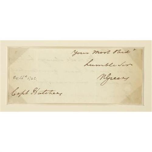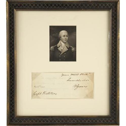<B>Revolutionary War Major-General Nathaniel Greene Signature</B></I> "<I>N Greene</B></I>", clipped from letter to a "<I>Capt Hutchens</B></I>", 7.25" x 3", dated "<I>Dec 25th 1782</B></I>" in another hand, secondary signature "<I>Mrs Greene</B></I>" on verso. Housed with an antique engraved portrait in a 13.25" x 14.75" modern wooden frame. Nathaniel Greene (1742- 1786), one of George Washington's ablest officers, was chosen to command the nation's demoralized Southern armies in the spring of 1780. Charleston and Savannah were in British hands while Loyalists pillaged the countryside at will. Over the course of a year, Greene steadily coaxed his redcoat opposite - Lord Cornwallis - across the Carolinas and to the latter's destruction at Yorktown. Marginal browning, smooth folds, very good condition. <BR><BR><b>Shipping:</b> Framed - with Glass, Small (<a target="_blank" href="http://www.heritageauctions.com/common/shipping.php">view shipping information</a>)