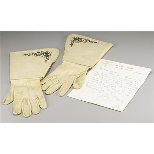 <B>Major General Philip Sheridan's Cavalry Gauntlets, Given to Captain Augustus C. Paul</B></I> Union Major General Philip Sheridan was one of the most famous cavalry generals in the United States Army during the Civil War. These gauntlets were used by him during the Civil War and given to an acquaintance, Captain Augustus C. Paul.<BR><BR>After graduating from West Point in 1853, Sheridan served in Texas and in the Pacific Northwest where he engaged in Indian fighting. It was in Oregon that he was slightly wounded and began to hone his negotiating skills with Indians that he would use after the Civil War.<BR><BR> A career army officer by the time of Fort Sumter, Sheridan was promoted to captain at the outbreak of the war. After a stint of duty in Missouri, Sheridan made it into battle at Pea Ridge, Arkansas. In May of 1862 he received an appointment as colonel of the 2nd Michigan Cavalry and was promoted to Brigadier General only months later. He would lead his cavaliers at Perryville, Stones River and Chickamauga. But it was during the Overland Campaign in May of 1864 that General Sheridan would have encountered the young Captain Augustus C. Paul, then serving as Assistant Adjutant General of US Volunteers to General A. A. Humphreys of the Union's 2nd Corps.<BR><BR>The son and grandson of career army officers, Augustus Chouteau Paul was appointed as Assistant Adjutant General to General Humphreys after his service at the Battle of Stones River and after being captured at the Battle of Spottsylvania. A handwritten, signed letter dated October 25, 1892 from Augustus C. Paul which accompanies these gauntlets states that Paul was given them by General Sheridan during Paul's service with 2nd Corps under General Humphreys. Further, in the letter Paul mentions that he took the stars off the gauntlets when he served as an officer of the 3rd US Cavalry. Paul's reference in the letter is to his post-Civil War service in the New Mexico and Arizona Territories when he reenlisted in the US Army as a 2nd lieutenant with 3rd US Cavalry after the war.<BR><BR>The gauntlets, made by Schuyler, Hartley & Graham, are of fine buff leather and measure approximately 16” from the tip on the middle finger to the longest point of the gauntlet that would reach to the upper forearm. There is elaborate gold-threaded embroidery in a foliate pattern at the upper corner of the gauntlet with the 'US' initials being especially heavily threaded. The remaining impressions are still visible where the single stars on each gauntlet have been removed as mentioned by Captain Paul in his accompanying letter written by him in 1892 while he served as Postmaster of the National Soldiers' Home in Virginia. The gauntlets are in otherwise very good condition.<BR><BR> Augustus C. Paul's service later in Wyoming and Western Nebraska from 1872 to 1876 culminated in his brush with history. The 3rd US Cavalry was part of the Big Horn and Yellowstone Expedition commanded by Brigadier General George Crook. Leaving for the Bighorn Mountains with General Crook, Paul was to meet with two other columns, including the one led by Lieutenant Colonel George Armstrong Custer. Due to not only the massacre at Little Big Horn, but also because of their own near-disastrous fight with a large contingent of Sioux and Cheyenne at the Rosebud River, neither Paul nor Crook were ever able to join their forces with Custer.<BR><BR>These cavalry gauntlets, presented to fellow US Army officer Augustus C. Paul by General Philip Sheridan, were obviously treasured (and used) by Captain Paul as he made his way through the Civil War and into the Indian Wars and are a remarkable showpiece.<BR><BR> <B>Provenance:</B></I> <I>Gen. Philip Sheridan, Augustus Paul, The Tharpe Collection of American Military History</B></I><BR> <BR><B>Exhibited:</B></I> <I>The Liberty Heritage Society Museum</B></I><BR><BR><b>Shipping:</b> Requires 3rd Party Shipping (<a target="_blank" href="http://www.heritageauctions.com/common/shipping.php">view shipping information</a>)