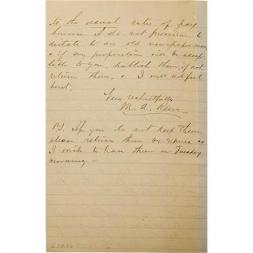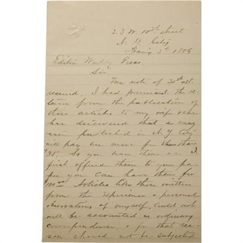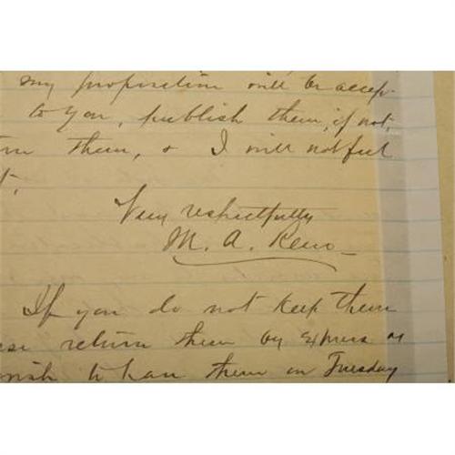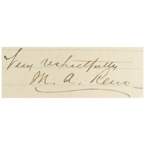 <B>MAJOR MARCUS A. RENO AUTOGRAPH LETTER SIGNED</B></I> - Lined paper, New York City, January 3, 1886, to the "<I>Editor Weekly Press</B></I>" <I>saac R. Pennypacker . Reno, a career military man, proved to be a capable and brave soldier during the Civil War, achieving a brevet rank of brigadier general for "meritorious services during the war." His military reputation would later suffer as many accused him of abandoning Custer at Little Bighorn in 1876. Reno was eventually given a dishonorable discharge based on various charges in 1880 that was much later changed to an honorable discharge in 1967 by a military board of review. By the time this letter was written, Reno was nearly destitute; he was trying to find a publisher for his memoirs and couldn't. This particular letter was in response to an offer by Pennypacker of $35.00 for two articles that Reno had submitted for publication, one about Custer and the other about Mosby. Reno is stating that he had been offered more by a New York publisher and offers to accept $100.00. He writes, in full: "<I>Your note of 30th ult. received. I had furnished the return from the publication of these articles to my wife & she has discovered that a magazine published in N.Y. City will pay her more for them than $35. As you have them & as I first offered them to you, you can have them for $100.00. Articles like these written from the experience & personal observations of myself, could not be accounted as ordinary correspondence, & for that reason should not be subjected to the usual rates of pay however I do not presume to dictate to an old newspaperman & if my proposition will be acceptable to you, publish them, if not, return them, & I will not feel hurt. Very respectfully,</B></I>" A postscript adds, "<I>If you do not keep them please return them by express as I wish to have them on Tuesday morning</B></I>". Fine condition, tipped to a larger sheet with acid content which has caused some toning. Includes an issue of the Little Big Horn Associates <I>Newsletter</B></I> dated November 1973 which includes an article about this series of series of correspondence, both housed in a grey custom library case. <BR><BR><b>Shipping:</b> Books & Catalogs (<a target="_blank" href="http://www.heritageauctions.com/common/shipping.php">view shipping information</a>)