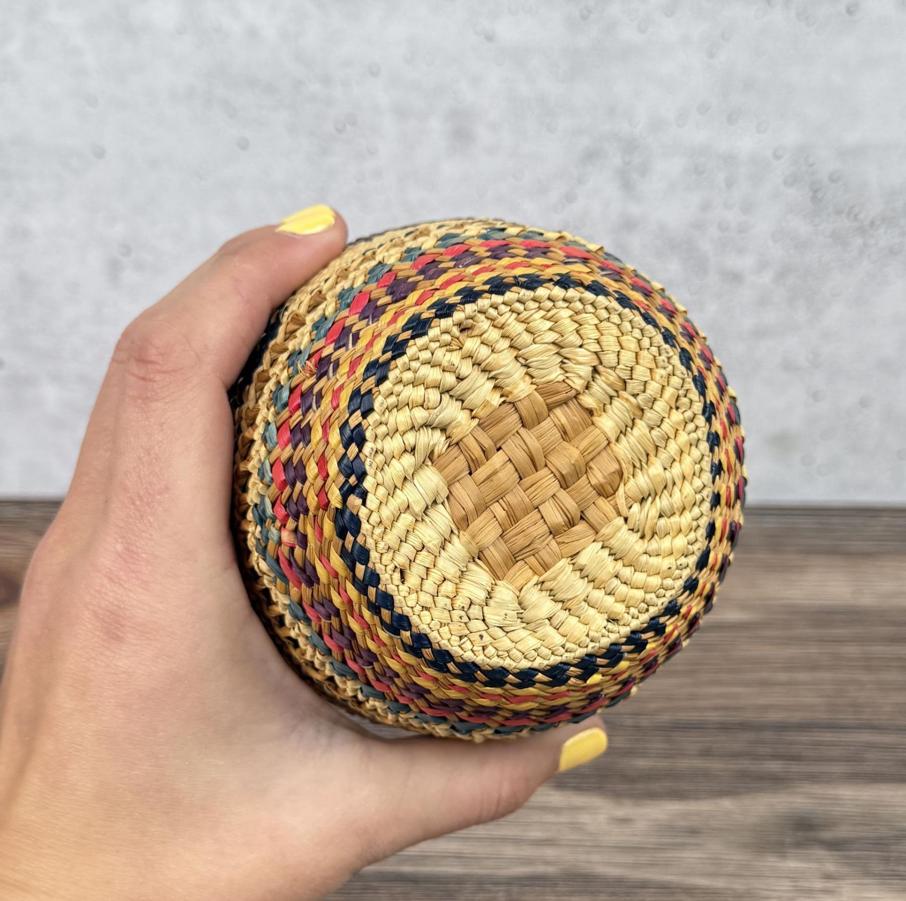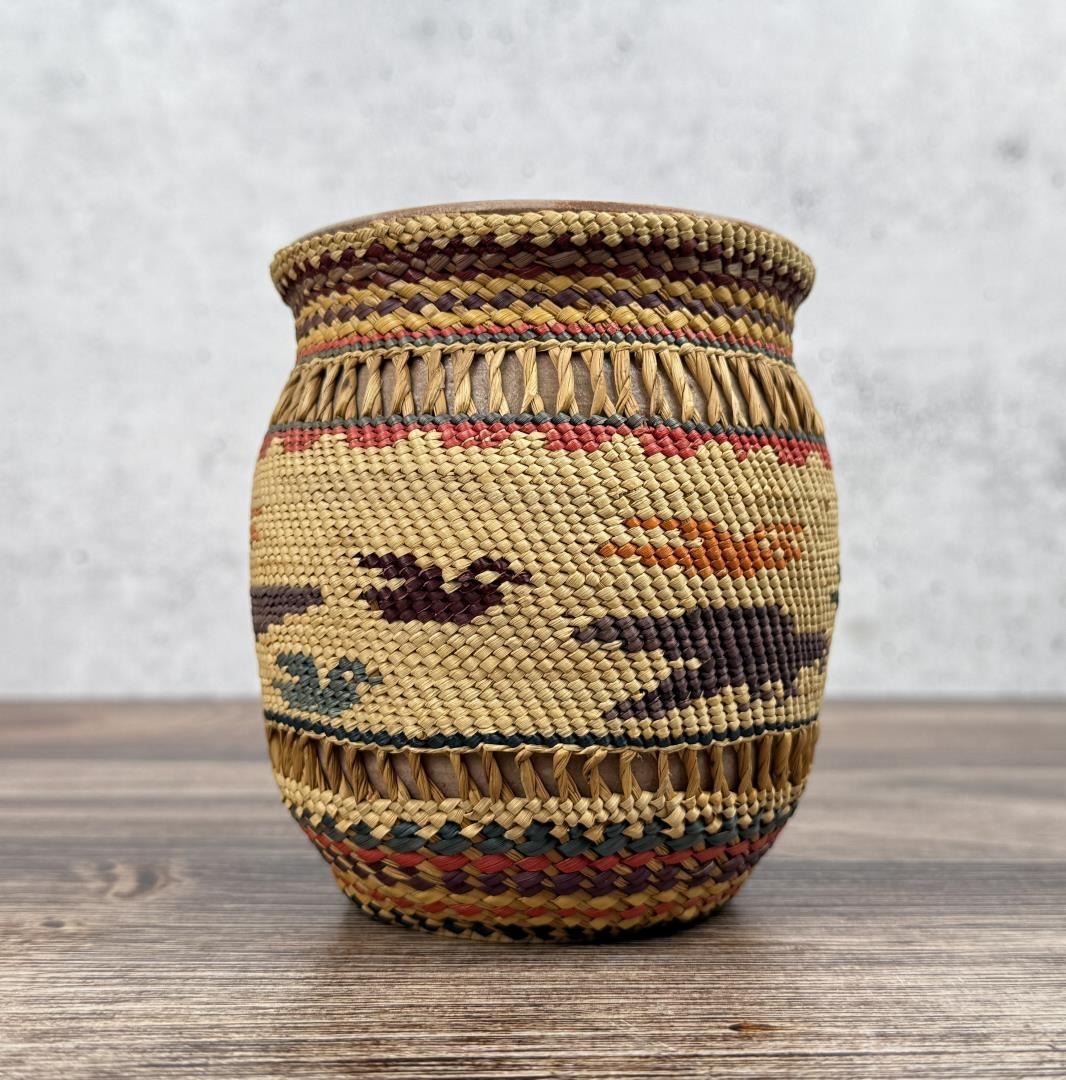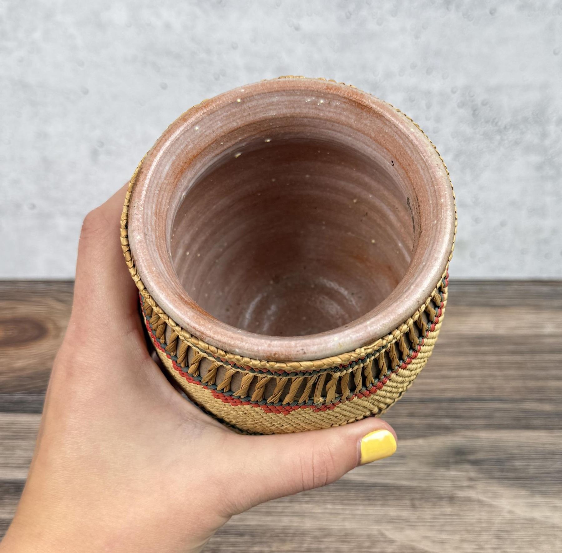 4 5/8" tall, 4 1/8" diameter. Woven over a bean pot.